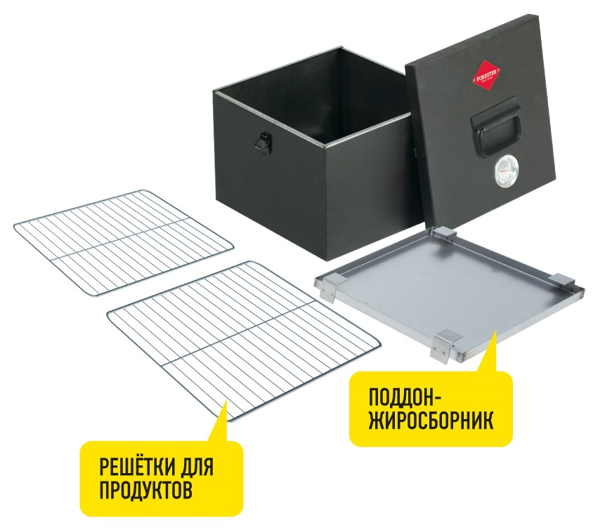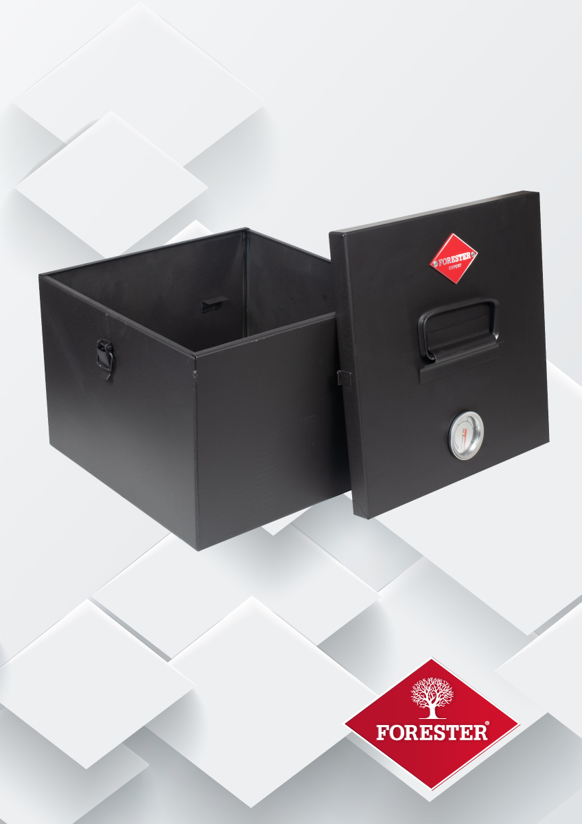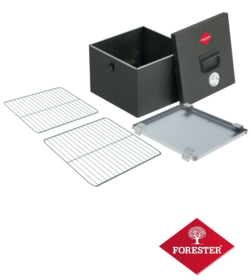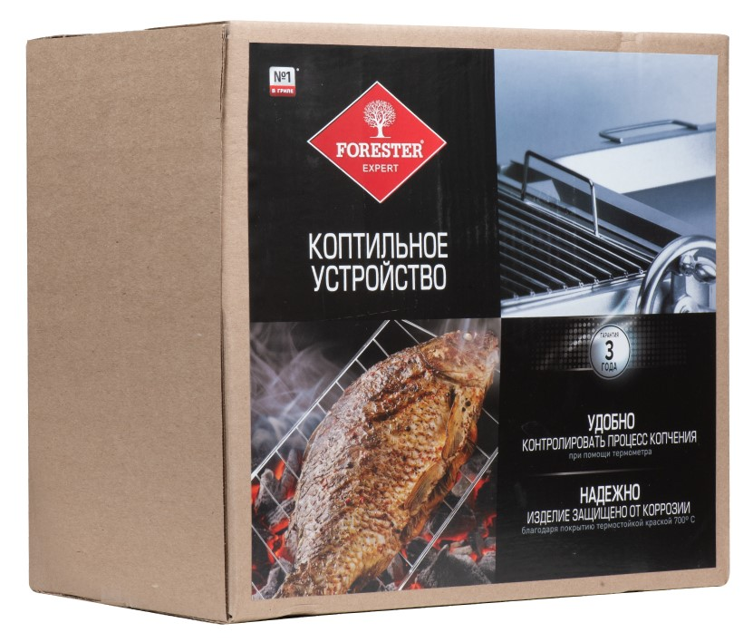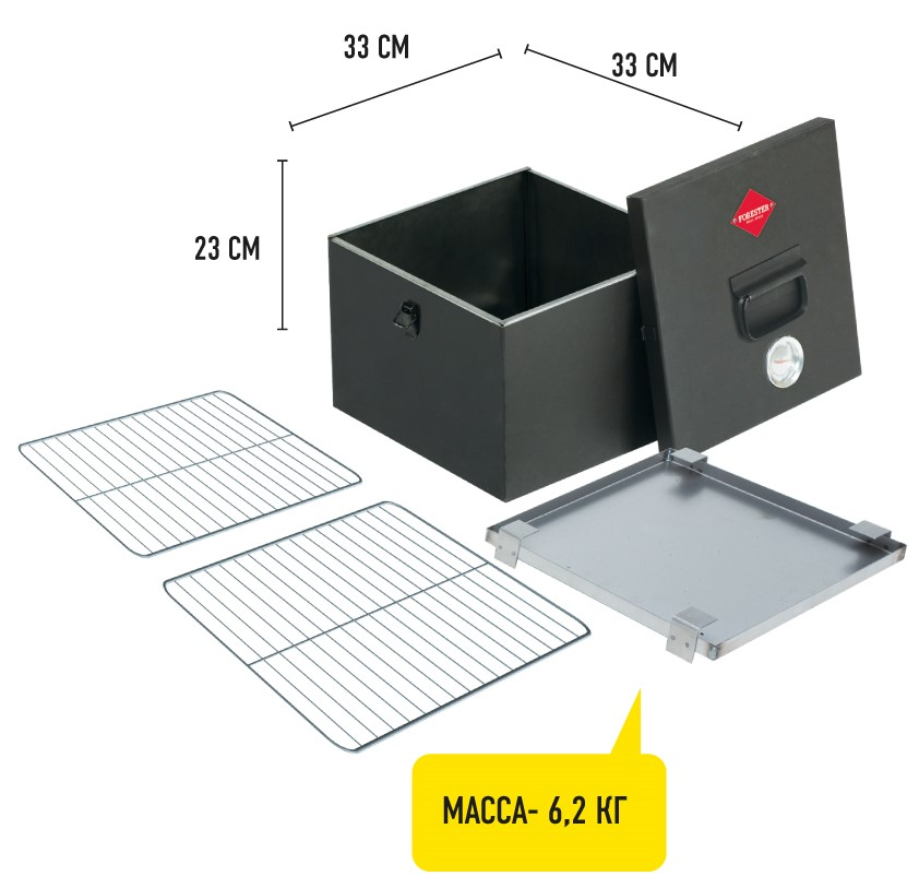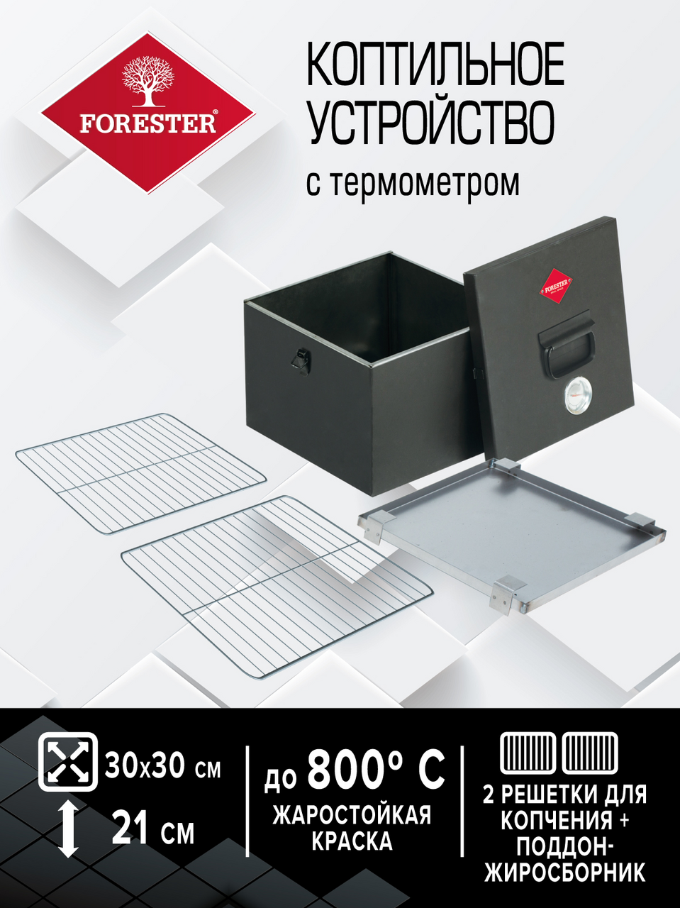 Forester Коптильное устройство стационарное с термометром. В комплект входят две решетки для продуктов. Термометр позволяет контролировать процесс копчения, не открывая крышку. Жаростойкое покрытие коптильни выдерживает температуру 700 С, тем самым продлевая срок службы изделия. Размер 30х30х20 см. Состав: корпус – сталь с жаростойкой краской; решетки для продуктов – сталь с коррозионностойким покрытием; поддон для жира – сталь. Толщина 1,2 мм. Вес: 6,24 кг.