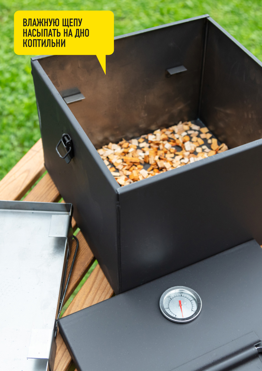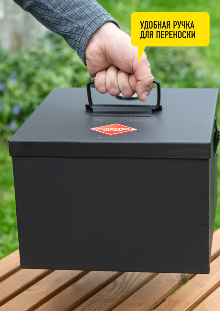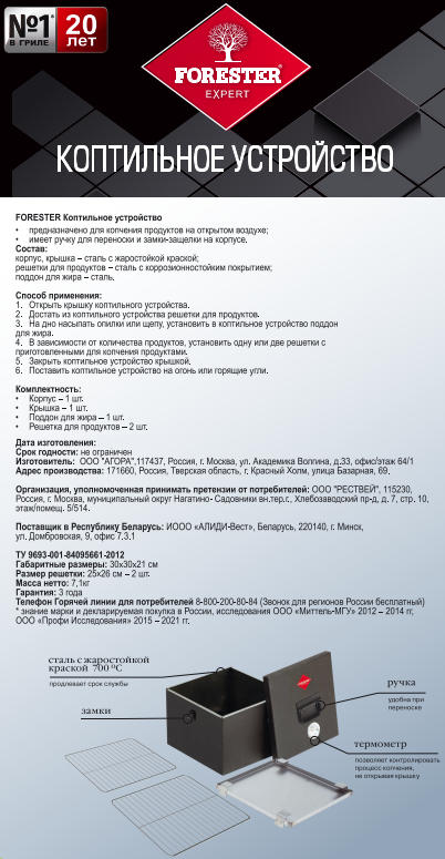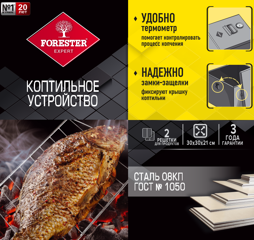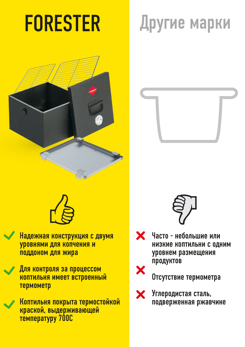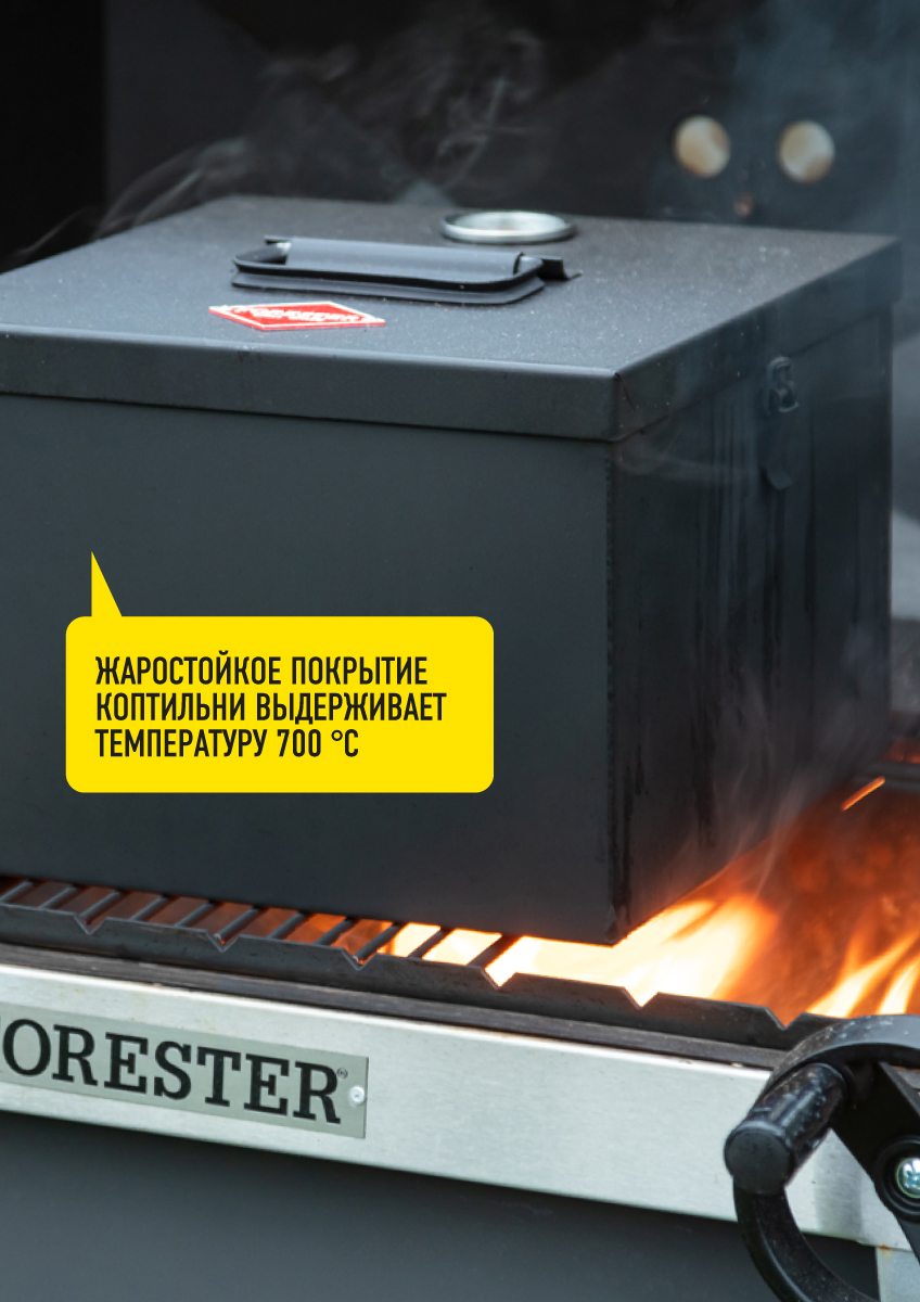 Forester Коптильное устройство стационарное с термометром. В комплект входят две решетки для продуктов. Термометр позволяет контролировать процесс копчения, не открывая крышку. Жаростойкое покрытие коптильни выдерживает температуру 700 С, тем самым продлевая срок службы изделия. Размер 30х30х20 см. Состав: корпус – сталь с жаростойкой краской; решетки для продуктов – сталь с коррозионностойким покрытием; поддон для жира – сталь. Толщина 1,2 мм. Вес: 6,24 кг.
