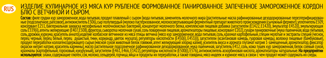 Мясо птицы, вода, мука пшеничная, ветчина, сырный продукт, масло подсолнечное, крахмал (картофельный, кукурузный), соль, белок соевый, сироп глюкозный сухой, стабилизаторы Е450, Е451, Е452, дрожжи, турмерик, паприка, антиокислители Е 316, мука кукурузная, экстракт белого перца, ароматизатор натуральный, декстроза, пищевые волокна, загуститель гуаровая камедь, глютен пшеничный.