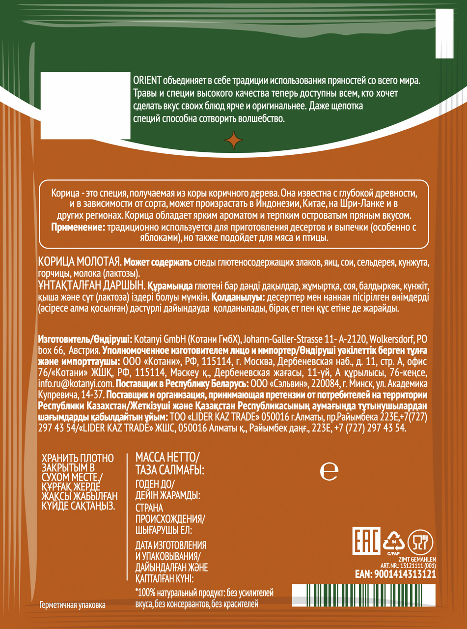 Корица - это одна из самых ароматных специй в мире. Она имеет неповторимый аромат и придает блюдам характерный пряный сладковатый вкус. Корица Orient подходит как для приготовления классических, так и экзотических блюд. Корица отлично сочетается с гвоздикой, кардамоном, кориандром, зирой, лавровым листом и мускатным орехом. Применение: подходит для выпечки, десертов, блюд индийской, карибской и марокканской кухни.
