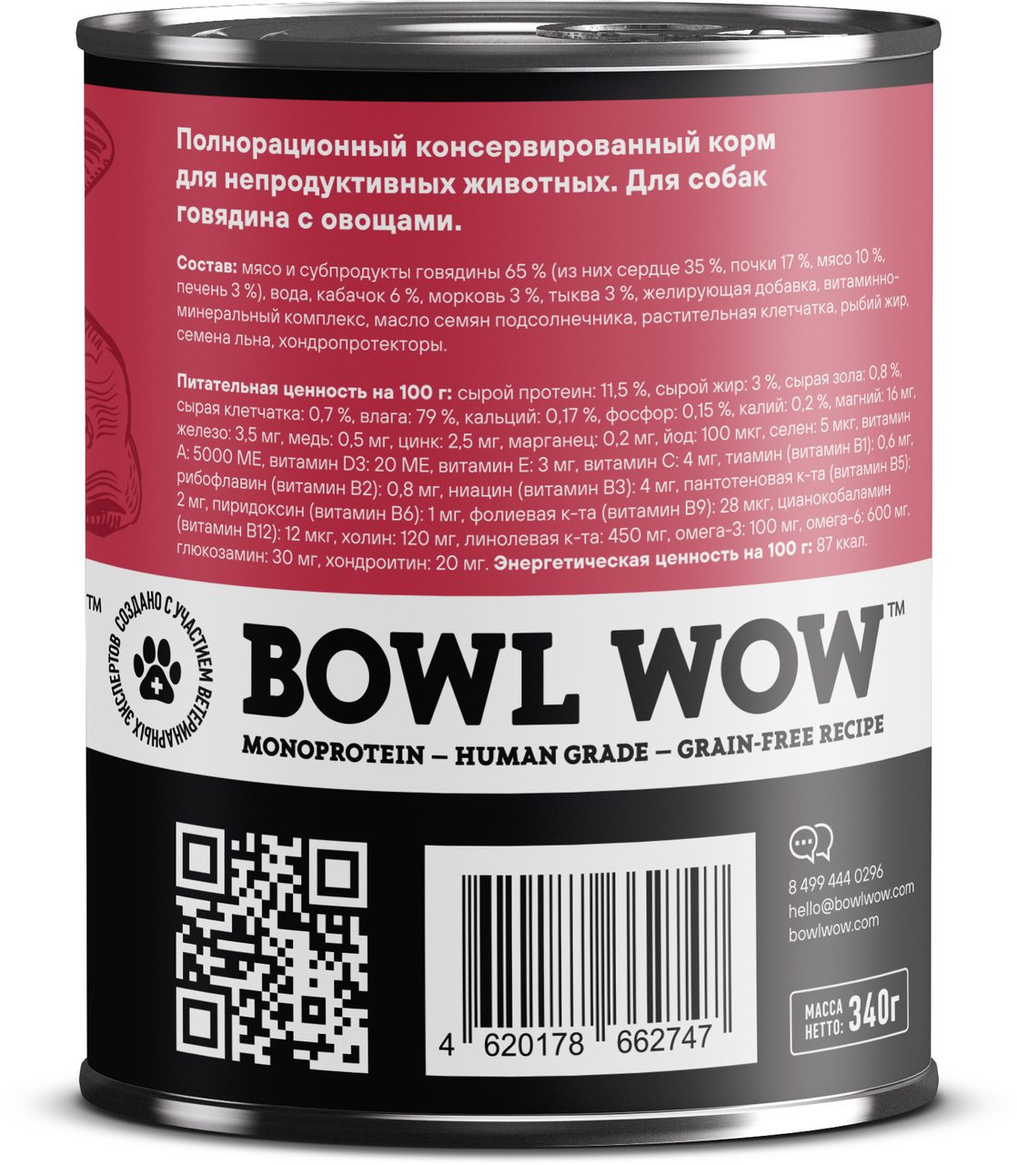 Полнорационный влажный корм в виде консервов Говядина с овощами разработан для взрослых собак всех пород из натуральных ингредиентов human grade качества. Беззерновая монопротеиновая формула на основе говядины содержит 91% животного белка с оптимальным аминокислотным профилем, необходимым для организма вашего питомца, и отличается высокой биологической ценностью и питательностью. Она подойдет даже для чувствительных питомцев, страдающих аллергией и непереносимостью других видов белка.