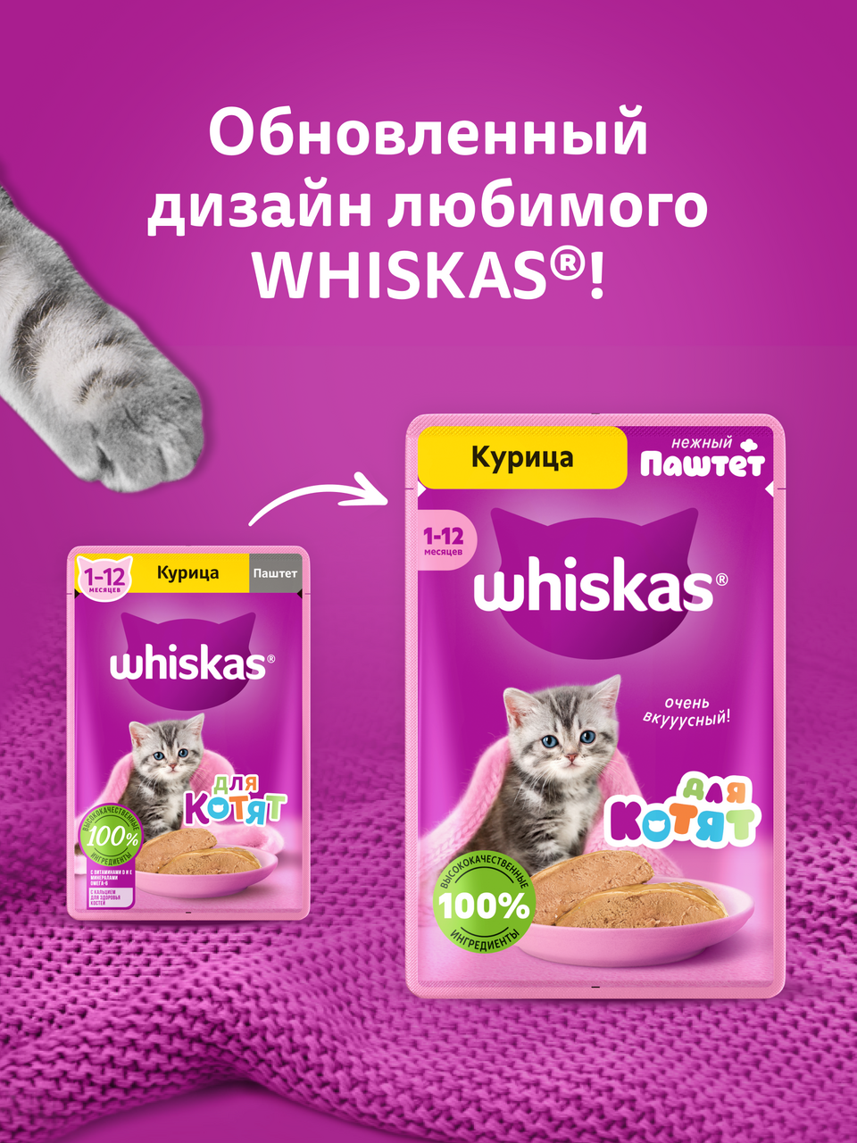 РационWhiskasдля котят Паштет с курицей — это сбалансированный рацион для здорового роста вашего малыша. Аппетитный паштет с курицей подарит котенку настоящее удовольствие. Все для замурррчательной жизни! РационыWhiskasдля котят позаботятся об иммунитете, поддержат здоровое пищеварение и обеспечат здоровый рост и развитие. Котята активно растут и с первых дней нуждаются в правильном питании. КормWhiskasдля котят создан с учетом всех особенностей развития организма котенка. Для здорового роста и правильного развития кормWhiskasдля котят содержит оптимальное сочетание питательных веществ, витаминов и минералов. 100% натуральные высококачественные ингредиенты: мясо и субпродукты – без добавления ароматизаторов, искуственных красителей и консервантов. Кальций для здоровья костей Омега-6 и цинк для здоровья кожи и шерсти Витамин А и таурин для хорошего зрения Витамины D, E и минералы. Ваш котенок будет мурчать от удовольствия!