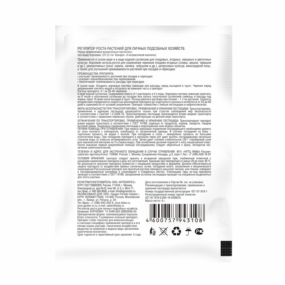 Корневин Фаско с весом 4 г – уникальный продукт, специально разработанный для успешного выращивания огородных растений и декоративных цветов. Его изготавливают из высококачественных материалов для создания оптимальных условий растениям. Он также способствует их крепкому и здоровому росту. Благодаря своим уникальным характеристикам, Корневин Фаско обеспечивает растительность всеми необходимыми питательными веществами, способствуя повышенному урожаю. Кроме того, этот удивительный продукт участвует в формирование здоровой корневой системы, улучшает ее устойчивость к неблагоприятным погодным условиям и защищает от вредителей. Этот продукт наиболее эффективен при поливе огородных культур на садовом участке, а также для декоративных цветочных растений, выращиваемых в горшках. Применение данного средства очень простое. Для обработки свежесрезанного черенка достаточно использовать сухой порошок корневина. Черенок, срезанный под наклоном, опускают на глубину 2-3 см. в воду и щедро обсыпают препаратом влажную часть. Затем его оставляют на 2-4 часа, чтобы продукт подсох. Заботьтесь о своих растениях с помощью корневина и наслаждайтесь богатым и ярким урожаем огородных культур или роск��шными декоративными цветами.