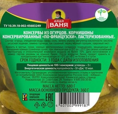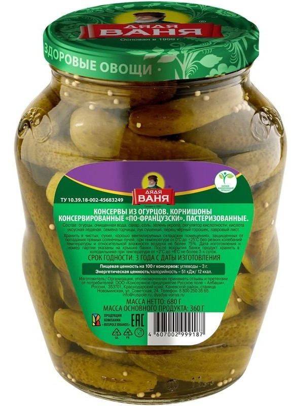 Корнишоны Дядя Ваня по-французски, 680 г – это вкусный продукт с традиционным соленым вкусом в специальном маринаде. Благодаря традиционной технологии консервирования огурчики сохраняют хрусткость, в полной мере наполняются ароматом специй и трав. В составе – только натуральные компоненты – огурцы, специи, уксусная кислота, поэтому корнишоны содержат множество витаминов и полезных микроэлементов. Продукт можно употреблять в качестве гарнира, а также он идеально подходит для приготовления салатов, пиццы, бутербродов, супов.