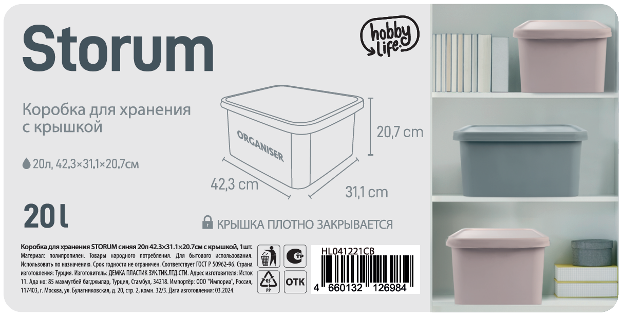 Коробка для хранения Hobby Life Storum синяя с крышкой 42.3 х 31.3 х 20.7см, 20л