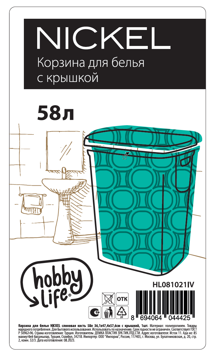 Корзина для белья Hobby Life Nickel с крышкой белая 36.1 x 47.4 x 57.6см, 58л обязательно должна быть в ванной, чтобы вещи, предназначенные для стирки, были сложены аккуратно и компактно. Корпус разработан из прочного и износоустойчивого пластика, поэтому долгие годы будет выглядеть презентабельно. Материал стойкий к контакту с влагой. Корзина имеет специальные отверстия, которые обеспечивают доступ воздуха к вещам, чтобы они не приобретали неприятный запах. Также оборудована удобной крышкой. Она может быть установлена даже в небольшой ванной комнате и при этом не будет загромождать пространство и не будет мешать перемещаться по комнате. Она оснащена удобной крышкой, которая защищает содержимое от пыли и грязи. Изготовлена из прочного материала, который обеспечивает долговечность и надежность использования. Корзина идеально подходит для хранения белья и других мелочей в ванной комнате или спальне, а ее стильный дизайн добавит уют и комфорт в интерьер.