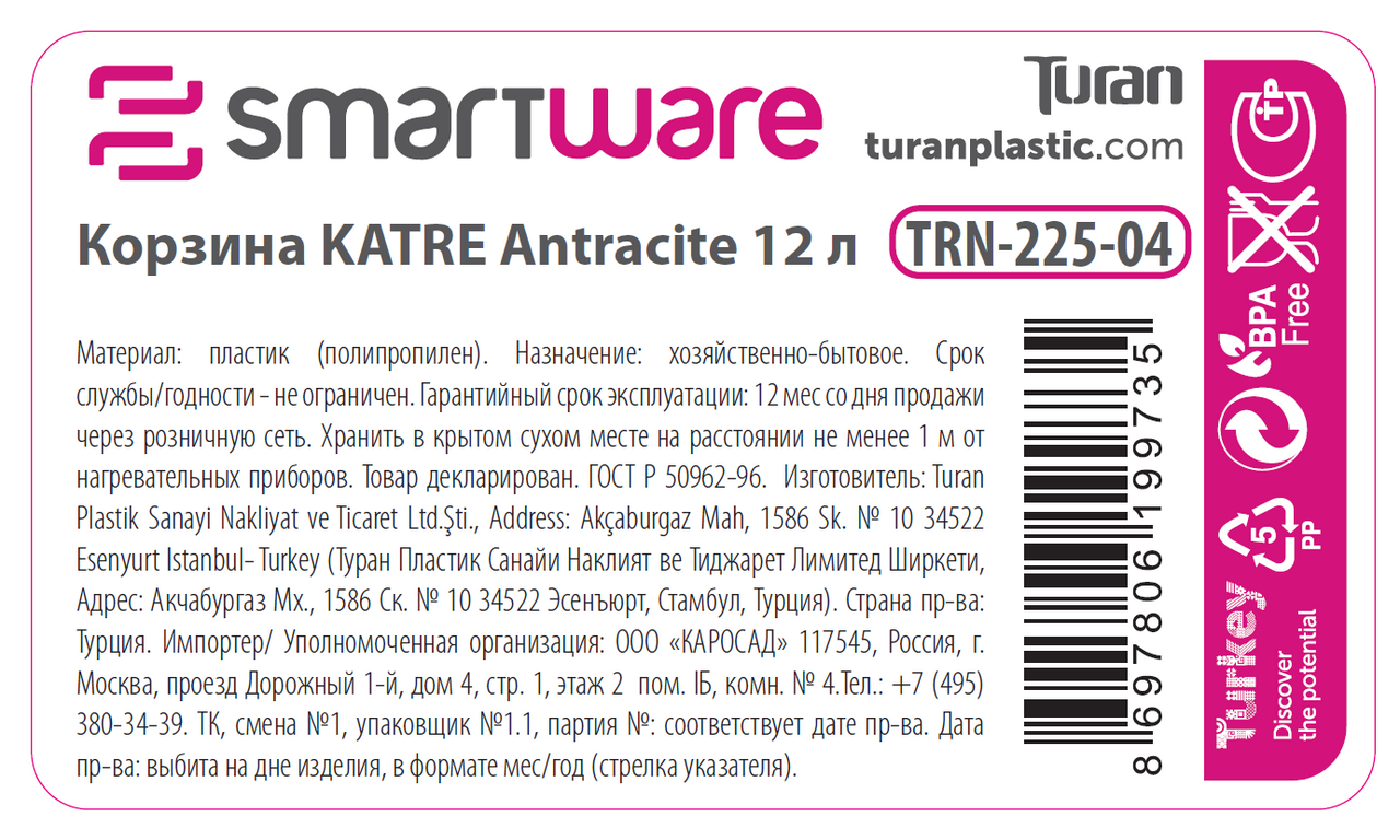 Корзина Smartware Katre Antracite для хранения 14 x 27.7 x 37см, 12л - высококачественный пластик обеспечивает не только стабильное качество и прочность формы, но илегкую чистку.Благодаря узкому размеру, корзину можно установить в малогабаритных помещениях.Высококачественный, BPA-свободный пластик (PP).