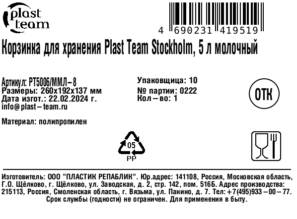 Корзина для хранения Plast Team Stockholm молочная 13.7 x 19.2 x 26см, 5л