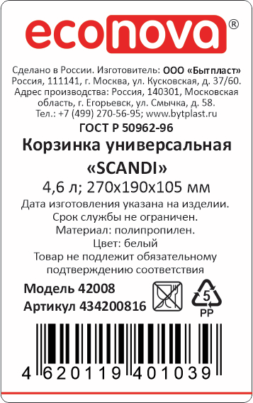 Корзинка Econova Scandi универсальная белая 4.6л, 27 х 19 х 10.5см