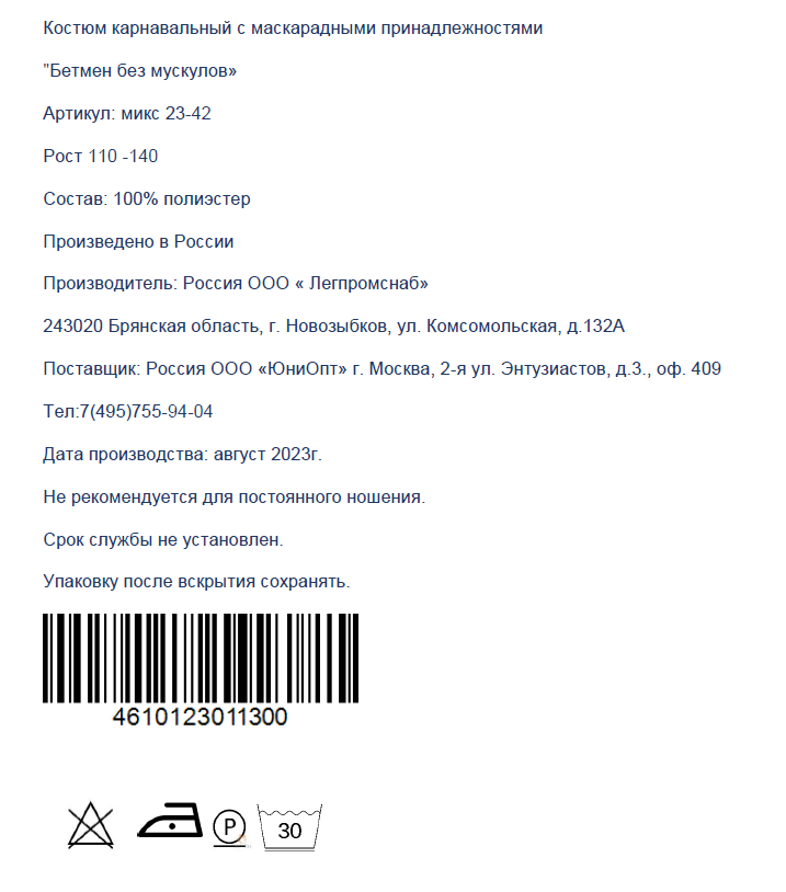 Ком��лект состоит из нескольких элементов, в числе которых тёмная сорочка, прямые брюки, шапка в виде маски с прорезями для глаз и длинными ушами, плащ. Все детали наряда выполнены с имитацией мускулов. Изделия дополняют друг друга и создают полноценный узнаваемый кинообраз. Не обошлось и без популярного принта летучей мыши на груди защитника, которая является своеобразным символом Бэтмена.Костюм отлично подойдёт мальчикам ростом от 104 до 152 см.