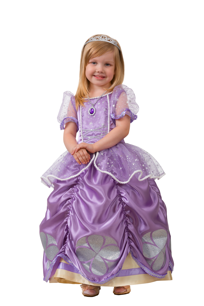 Костюм карнавальный София Прекрасная ДИСНЕЙ поможет создать яркий и волшебный образ принцессы. Он отлично подойдет любой девочке — на костюмированном мероприятии, утреннике или детском празднике она наверняка будет в центре внимания и не останется без комплиментов. Представленный костюм создавался по мотивам полюбившегося многим мультфильма о жизни обычной девочки Софии, которая в один прекрасный день стала прекрасной принцессой. Эта героиня не только красива, но и невероятно храбра — она побеждает врагов при помощи особого магического талисмана. Данный наряд включает в себя нежное и воздушное платье светло-лилового цвета, выполненное из высококачественного текстиля. Оно характеризуется пышной юбкой длиной ниже колен, декорированной многочисленными сборками, узорами в виде цветов и изящным кружевом.