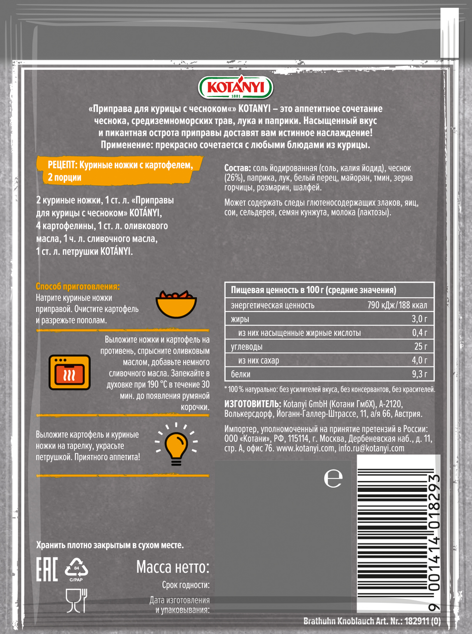 Приправа для курицы с чесноком Kotanyi - это аппетитное сочетание чеснока, средиземноморских трав, лука и паприки. Насыщенный вкус и пикантная острота приправы доставят вам истинное наслаждение.Применение: прекрасно сочетается с любыми блюдами из курицы.Состав: соль йодированная (соль, калия йодид), чеснок 26%, паприка, лук, белый перец, майоран, тмин, зерна горчицы, розмарин, шалфей.Пищевая ценность в 100г: жиры - 3,2г, из них насыщенные жирные кислоты - 0,5г, углеводы - 32г, из них сахар - 17г, белки - 8,6г, соль - 42,2г.Энергетическая ценность: 867кДж/206ккалМожет содержать следы глютеносодержащих злаков, яиц, сои, сельдерея, семян кунжута, орехов, молока, лактозы.Хранить плотно закрытым в сухом местеСрок хранения: 47 месяцев