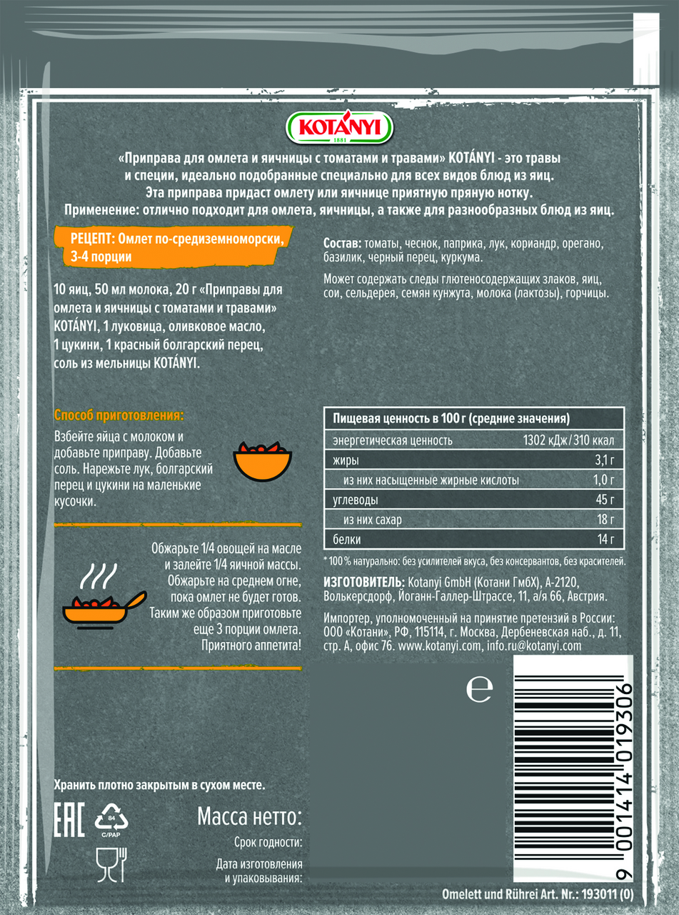 Приправа Kotanyi Для омлета и яичницы с томатами и травами, 20г