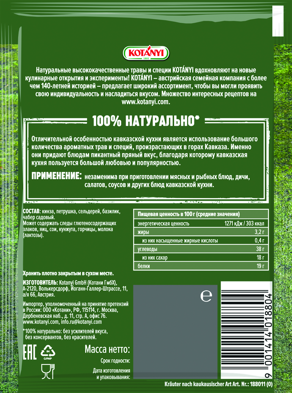 Приправа Кавказские травы Kotanyi, 9 г поможет придать блюдам пикантный акцент. Восточная кухня отличается пряными ароматами и разнообразием вкусов. В состав специй входят кинза, базилик, садовый чабер и сельдерей. Такое сочетание трав подходит для блюд из мяса и рыбы, морепродуктов, различных соусов и салатов.