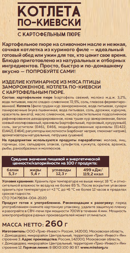 Картофельное пюре (картофель свежий, молоко 3,2%, вода питьевая, масло сладко-сливочное 72,5%, соль, глюкоза ферментированная), Котлета (филе грудки кур замороженное, вода питьевая, сухари панировочные (мука пшеничная, вода питьевая, соль, дрожжи, куркума, краситель аннато), масло сливочное, масло растительное подсолнечное рафинированное дезодорированное, кожа тушек кур замороженная, белок соевый изолированный, крахмалы (картофельный, гороховый, кукурузный), соль, загустители (E461, E466, модифицированные крахмалы (E1422, E1442), E464), регуляторы кислотности (карбонат натрия, глюконат натрия), ароматизаторы натуральные, петрушка сушеная).