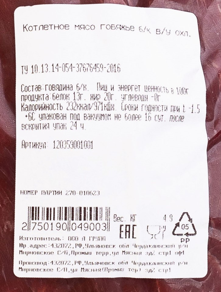 Мясо котлетное из говядины Домашний Ресторатор охлажденное, ~4.9кг