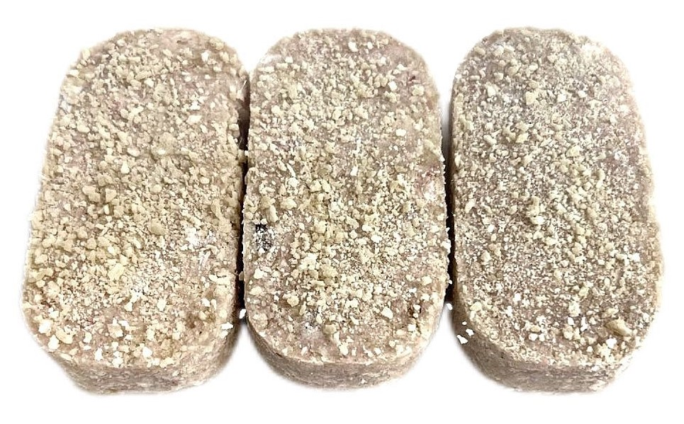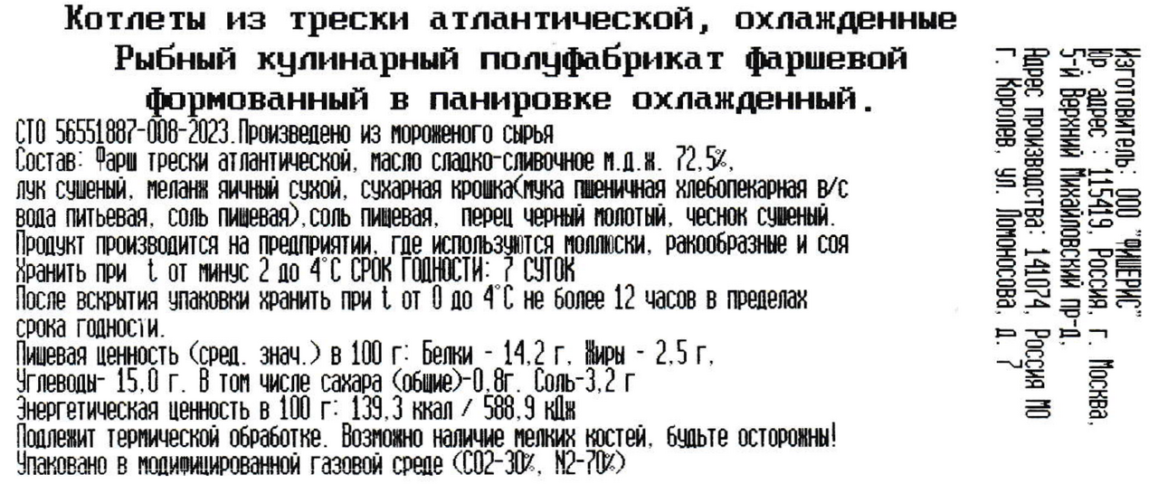 Фарш трески, масло сладко-сливочное, лук сушёный, меланж яичный сухой, сухарная крошка мука пшеничная хлебопекарная, соль пищевая, вода питьевая, соль пищевая, перец чёрный молотый, чеснок сушёный.