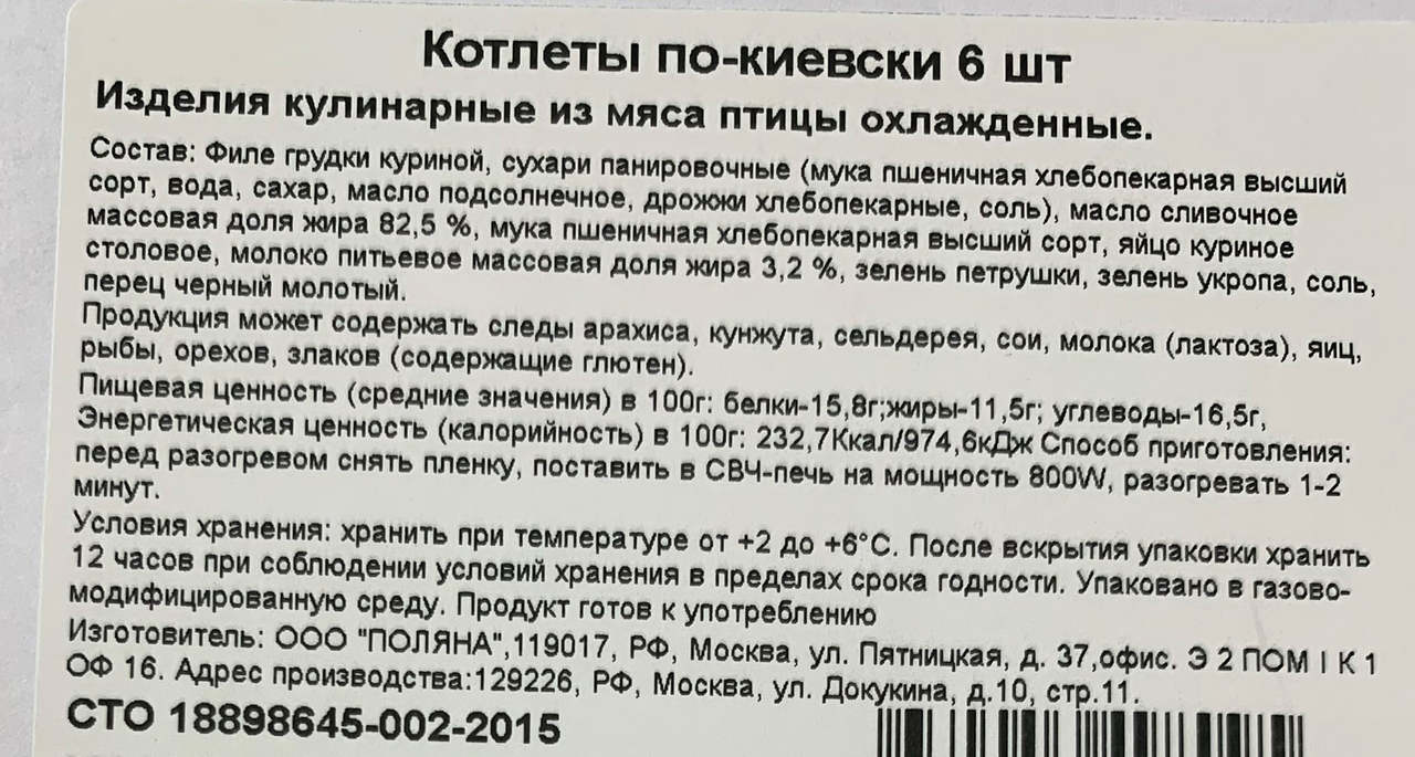 Котлеты Кулинариум по-киевски– сытный, но между тем легкий и быстроусвояемый продукт, который выручит вас, когда нужно быстро накормить семью, не потратив на это много времени. Просто добавьте к котлетам любой гарнир — и получите вкусный, а главное – полезный обед или ужин. Продукт можно подавать и как самостоятельное блюдо. В составе котлет — натуральные компоненты. Герметичная тара позволят хранить продукт свежим длительное время. До приготовления продукт следует хранить в холодильнике или морозильной камере.
