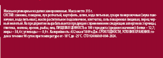 Свинина, говядина, лук репчатый, картофель, шпик, вода питьевая, сухари панировочные (мука пшеничная, вода питьевая), масло растительное подсолнечное, клетчатка, соль поваренная пищевая, перец черный молотый.