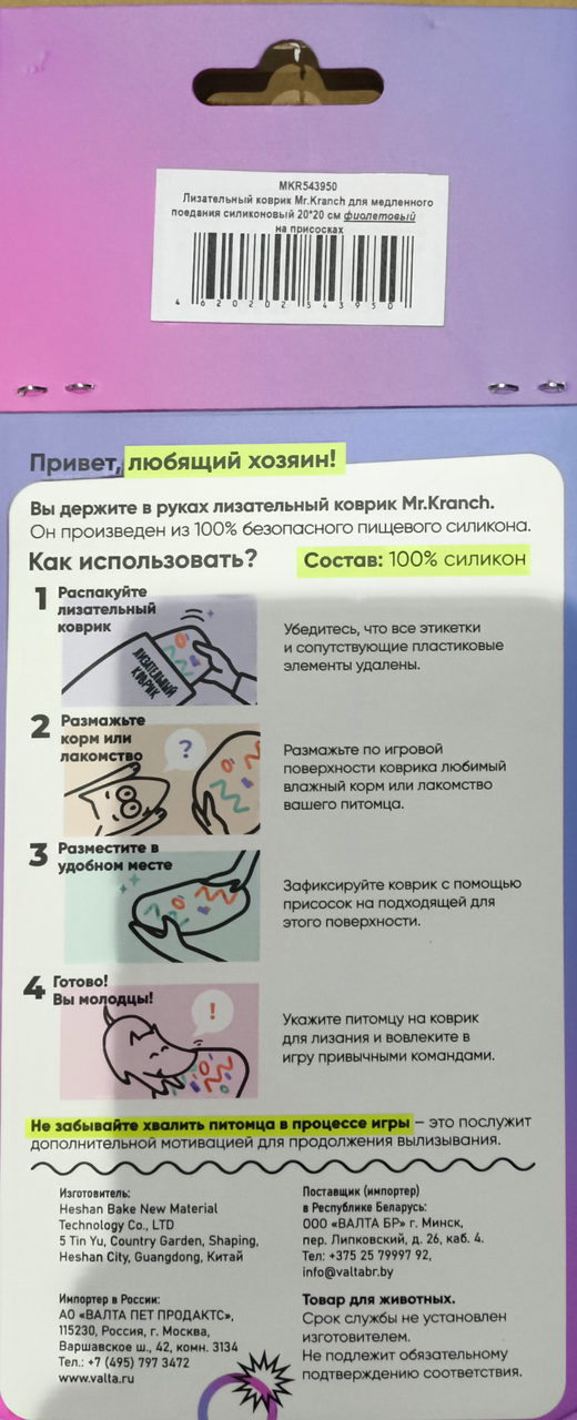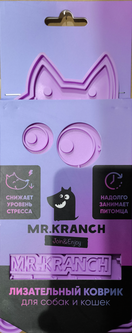 Лизательный коврик Mr.Kranch для медленного поедания предотвращает сверх быстрое заглатывание пищи питомцем, нормализуя работу ЖКТ.