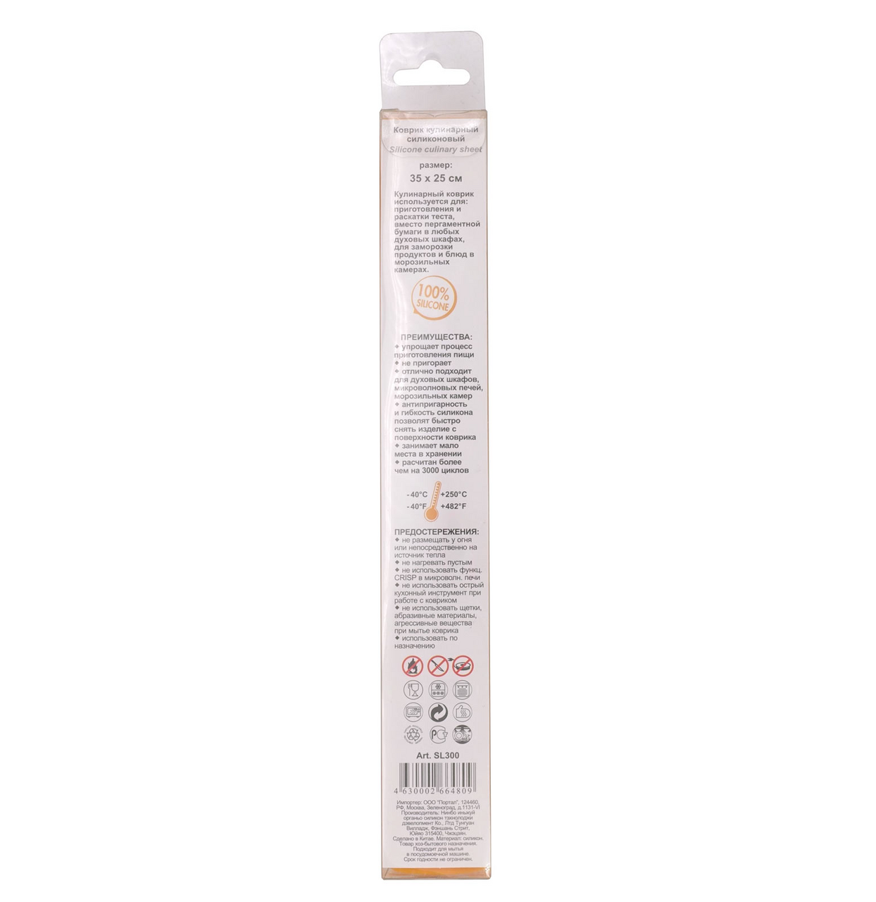 Кулинарный коврик используется для приготовления и раскатывания теста, для выпечки (вместо пергаментной бумаги) в любых духовых шкафах, для заморозки продуктов и блюд в морозильных камерах. Преимущества: -упрощает процесс приготовления пищи, - не пригорает, - отлично подходит для духовых шкафов, микроволновых печей и морозильных камер, - антипригарность и гибкость силикона позволят быстро снять изделие с поверхности коврика, - ��анимает мало места в хранении, - рассчитан более чем на 3000 циклов, - температурный диапазон от -40С до +250С . Предостережения: не размещать у открытого огня или непосредственно на источниках тепла, не нагревать пустым, не использовать функцию CRISP в микроволновой печи, не использовать острый кухонный инструмент при работе с ковриком, не использовать щетки, абразивные материалы, агрессивные вещества при мытье коврика, использовать по назначению. Подходит для мытья в посудомоечной машине. Материал: 100% силикон