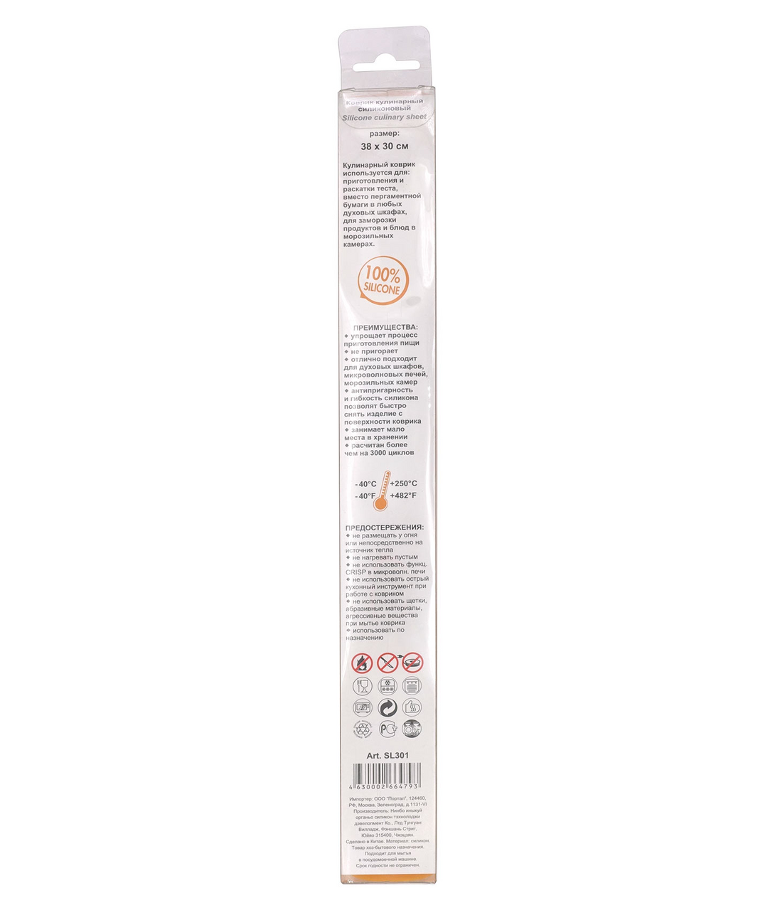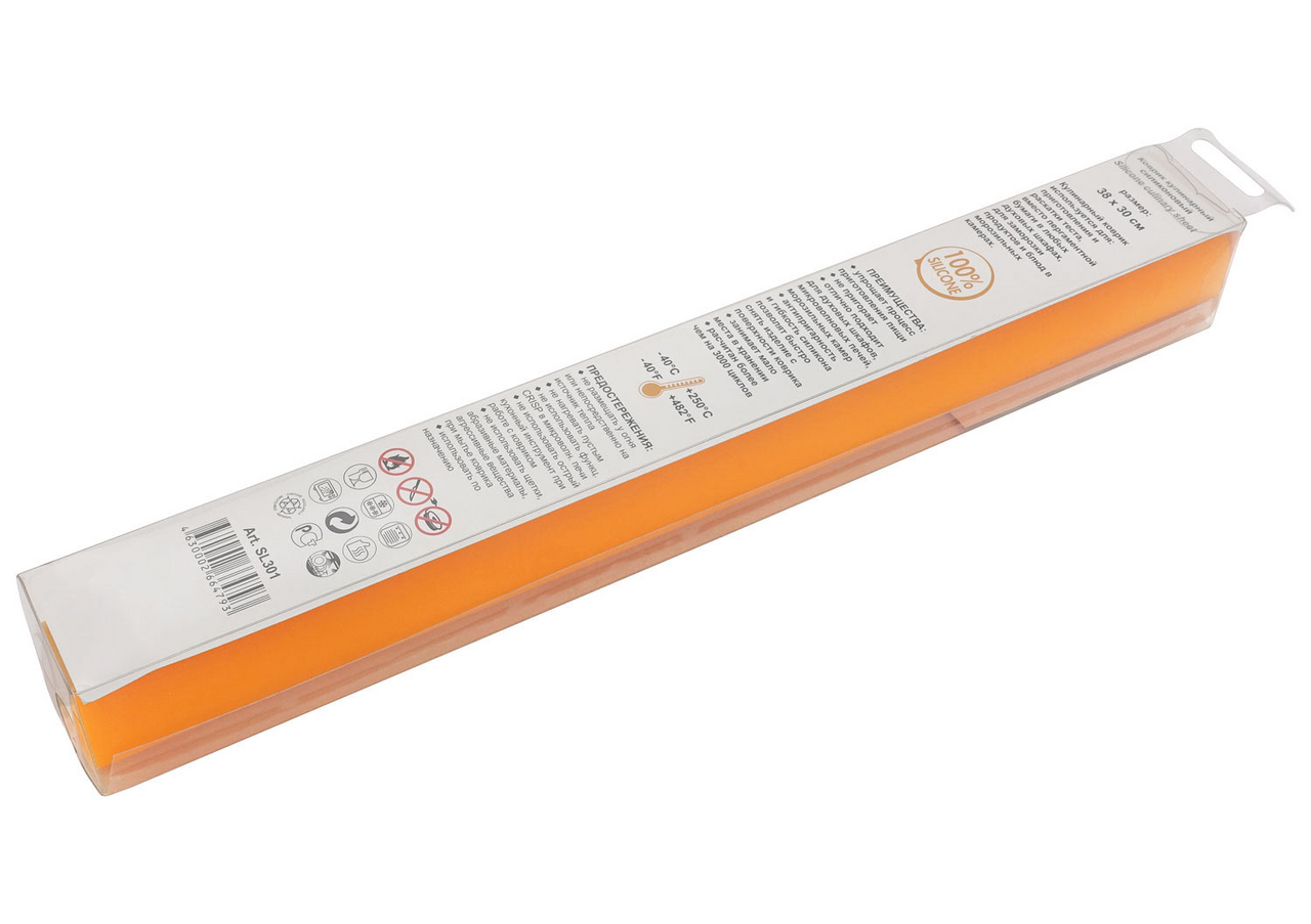 Коврик Nova Home силиконовый, 38 x 30см используется для приготовления и раскатывания теста, для выпечки (вместо пергаментной бумаги) в любых духовых шкафах, для заморозки продуктов и блюд в морозильных камерах. Преимущества: -упрощает процесс приготовления пищи, - не пригорает, - отлично подходит для духовых шкафов, микроволновых печей и морозильных камер, - антипригарность и гибкость силикона позволят быстро снять изделие с поверхности коврика, - занимает мало места в хранении, - рассчитан более чем на 3000 циклов, - температурный диапазон от -40С до +250С . Предостережения: не размещать у открытого огня или непосредственно на источниках тепла, не нагревать пустым, не использовать функцию CRISP в микроволновой печи, не использовать острый кухонный инструмент при работе с ковриком, не использовать щетки, абразивные материалы, агрессивные вещества при мытье коврика, использовать по назначению. Подходит для мытья в посудомоечной машине. Материал: 100% силикон