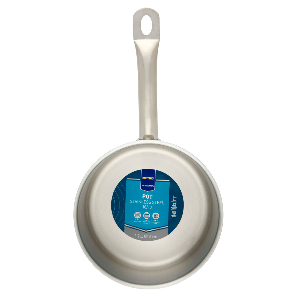 METRO PROFESSIONAL Ковш, 2.2 л, 18 см востребован на любой кухне. В нем можно готовить различные блюда и разогревать продукты. Он совместим с любыми плитами, включая индукционные. Его можно приобрести для профессиональной деятельности и для личного использования в домашних условиях. У ковша классический дизайн. Полированная стальная поверхность выглядит стильно. Длинная ручка исключает контакт с огнем. На ее конце имеется отверстие, что позволяет подвешивать изделие. Ковш изготовлен из нержавеющей стали. Это самый популярный и надежный материал для кухонной посуды. Он обладает антикоррозийными свойствами, способен выдерживать нагрев до высоких температур, не деформируется и устойчив к воздействию внешних факторов (включая агрессивные). Сталь абсолютно безопасна, не впитывает запахов, не выделяет токсичных веществ и не меняет вкусовые качества продуктов. Ухаживать за ним легко. Его можно мыть под проточной водой (горячей и холодной). Разрешается использовать различные моющие средства (включая абразивные). При правильном уходе может использоваться долгое время.