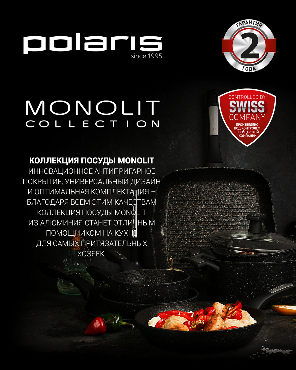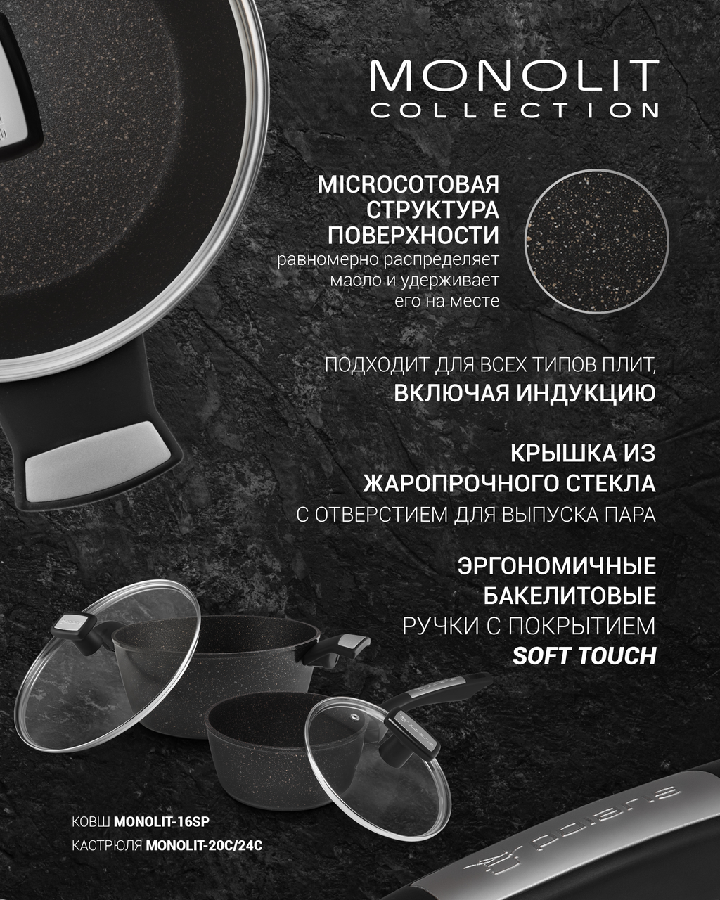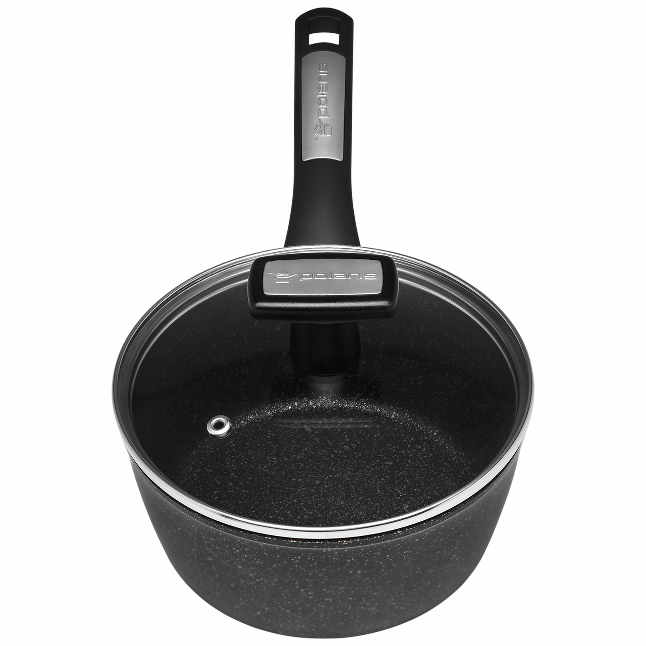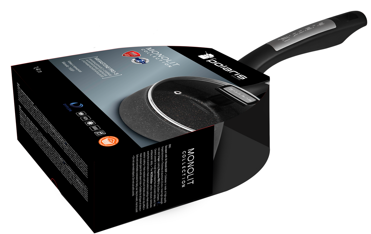 Ковш с крышкой Polaris Monolit 16SP кованый алюминий, 1,3 л, 16 см имеет инновационное высокопрочное антипригарное 5-слойное внутреннее покрытие с керамической крошкой в составе Megastone PRO-5 от компании Dyflon, а также термостойкое внешнее покрытие. Микросотовая структура поверхности равномерно распределяет масло и удерживает его на месте. Изделие оснащено эргономичной бакелитовой ручкой с покрытием Soft Touch и крышкой из жаропрочного стекла с отверстием для выпуска пара. Ковш подходит для всех типов плит, включая индукцию. Это отличное приобретение для домашнего использования, а также для кафе, ресторанов и других заведений.