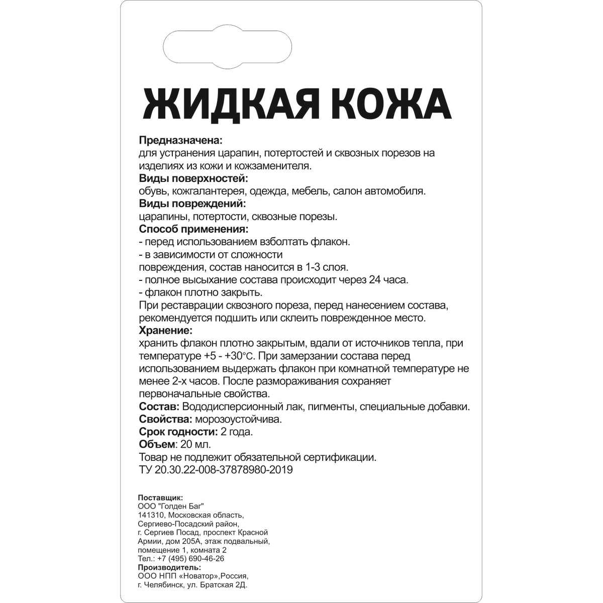 Предназначено для ремонта поврежденных покрытий и восстановления их первоначального внешнего вида. Состав универсален и подходит для реставрации: 1) мягкой мебели; 2) салона автомобиля; 3) кожгалантереи; 4) одежды и обуви. Средство представляет собой жидкий полимерный состав на основе вододисперсионного лака, цвет — бежевый. Продается во флаконе объемом 20 мл. Раствор тщательно взбалтывается и в 1-3 слоя наносится на поврежденное место — порез, царапину или разрыв — и оставляется до полного высыхания.