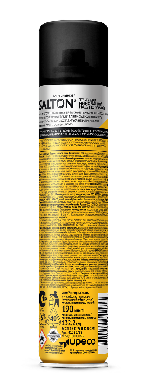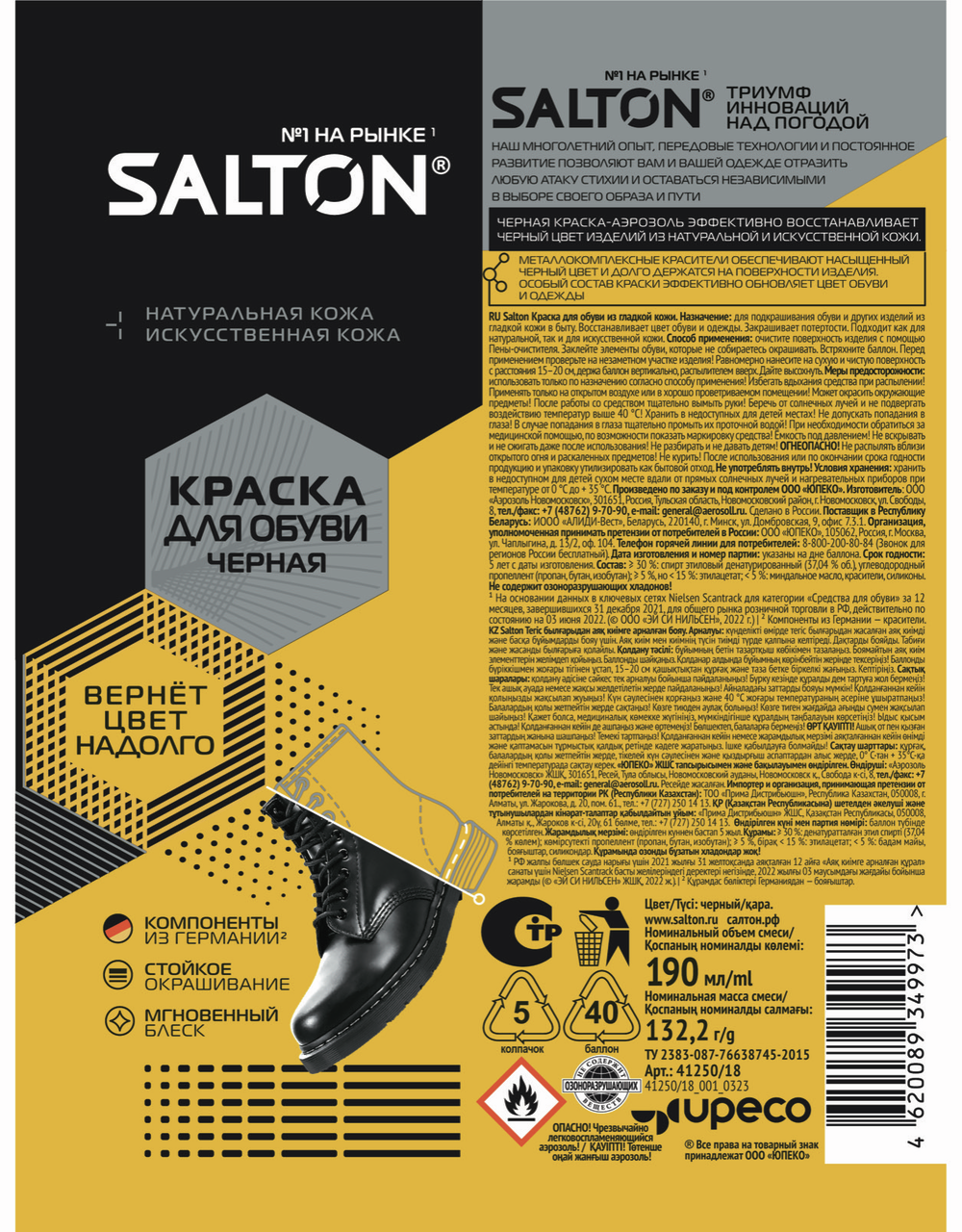Изделия из черной кожи являются классикой и никогда не выходят из моды, однако этот материал более всего подвержен выгоранию и заметнее всего тускнеет под воздействием влаги и других внешних факторов. Также на черной коже лучше всего заметны механические повреждения. Обновить черный цвет кожи, а также эффективно закрасить дефекты поможет краска для гладкой кожи Salton. Это средство для обуви в виде спрея обеспечивает стойкое равномерное окрашивание черной кожи. Краска для кожи восстанавливает внешний вид обуви: закрашивает потертости и царапины, освежает цвет изделия. Краска для обуви черная от Salton подходит для окрашивания черной обуви, а также сумок, курток, ремней и других изделий из гладкой кожи. Краска также подхо��ит для обработки искусственных кож. Краска в виде спрея удобно и быстро наносится на изделие. Подарите Вашим черным кожаным вещам вторую жизнь с краской Salton. Перед применением проверьте на незаметном участке изделия.