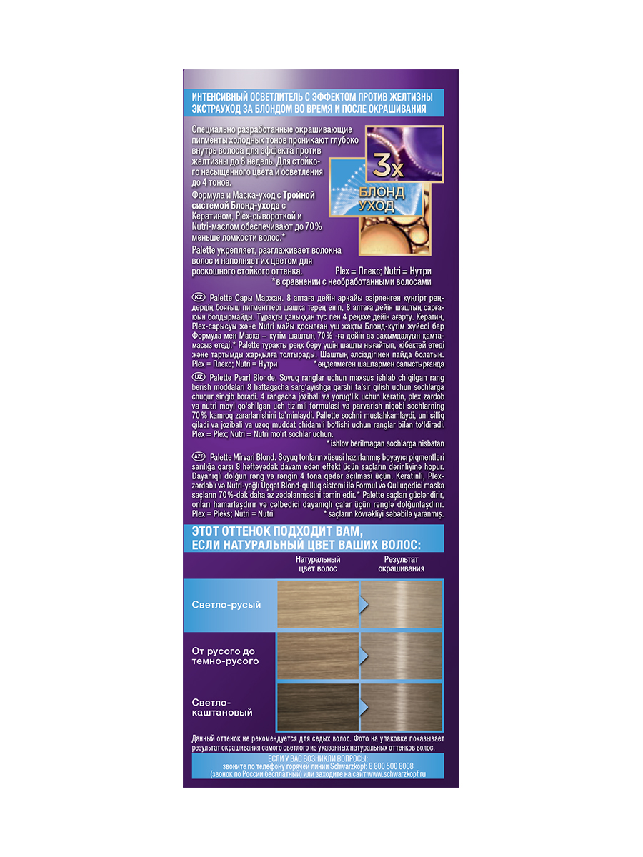 Интенсивный осветлитель с эффектом против желтизны. Экстрауход за блондом во время и после окрашивания. Специально разработанные окрашивающие пигменты холодных тонов проникают глубоко внутрь волоса для эффекта против желтизны до 8 недель. Для стойкого насыщенного цвета и осветления до 4 тонов. Формула и маска-уход с тройной системой блонд-ухода с кератином, plex-сывороткой и nutri-маслом обеспечивают до 70% меньше ломкости волос.
