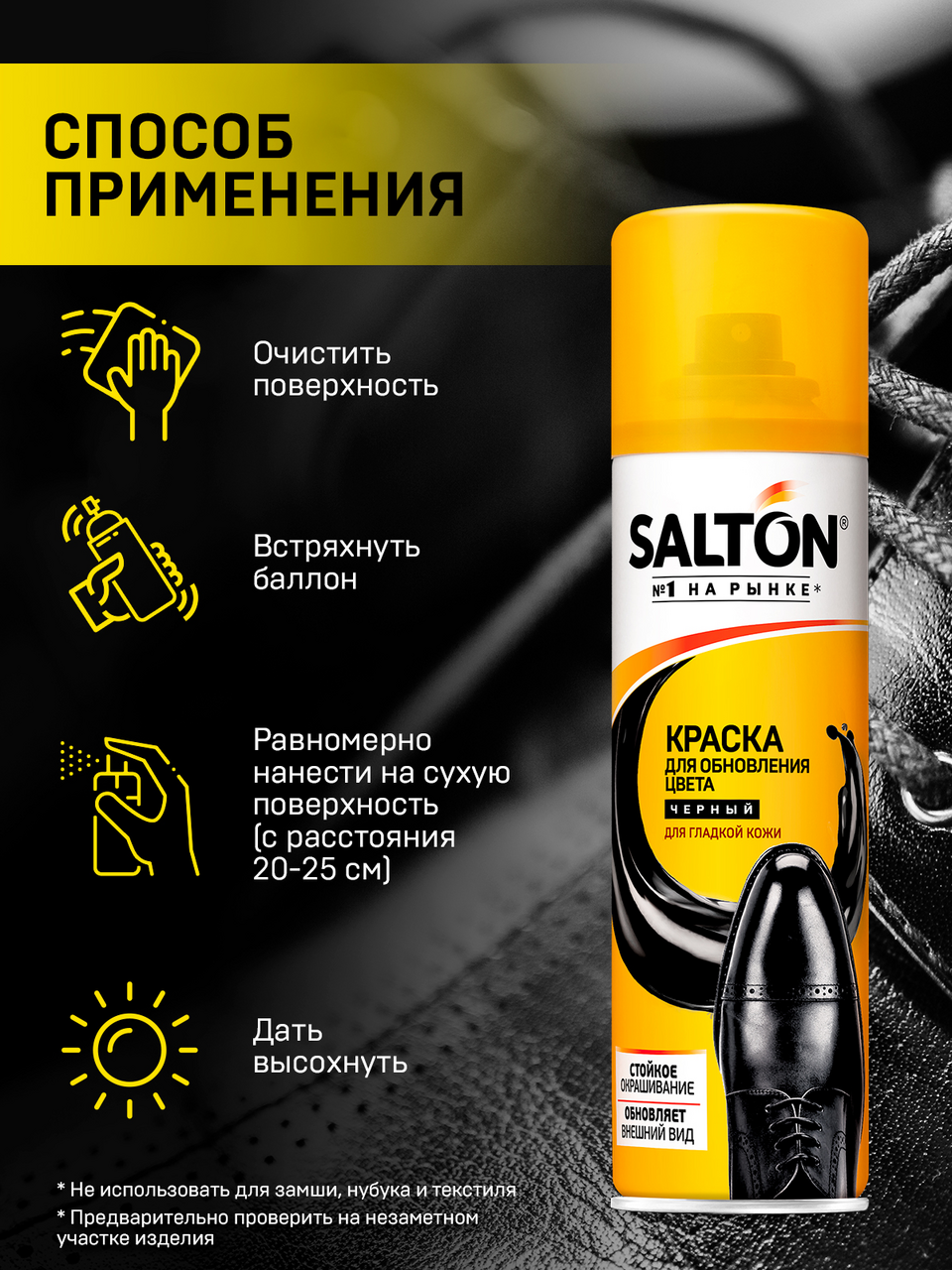 Эффективно восстанавливает цвет обуви, одежды и аксессуаров из гладкой кожи Стойкое окрашивание Обновляет внешний вид гладкой кожи Подходит для окрашивания сумок, курток, ремней и других изделий из гладкой кожи