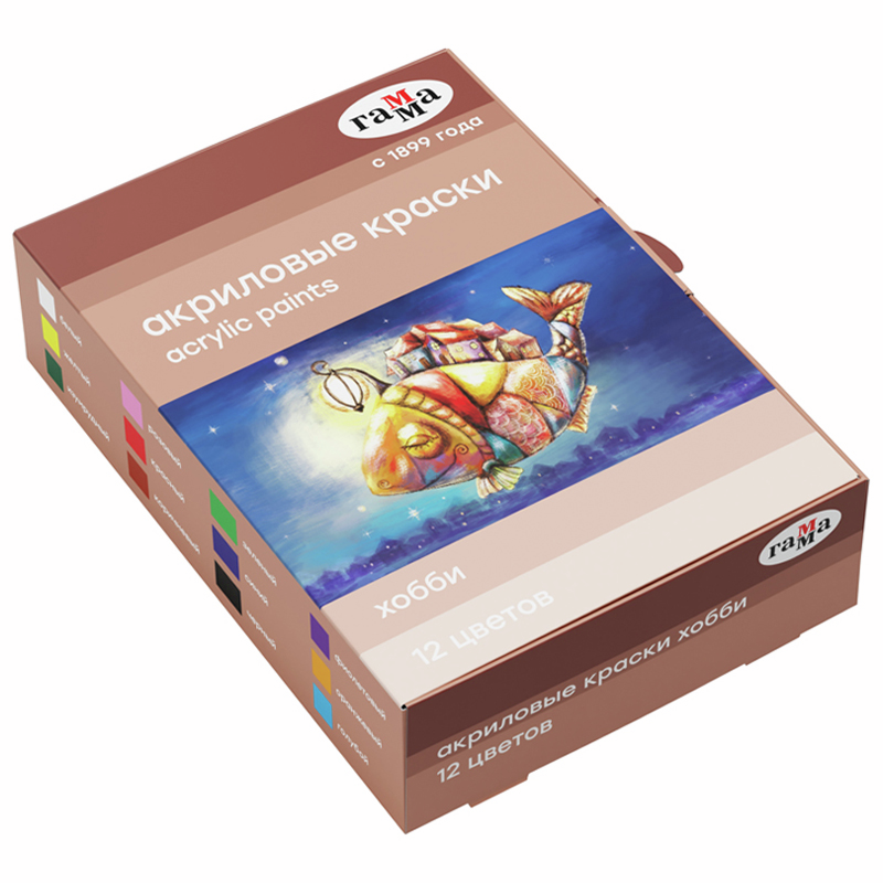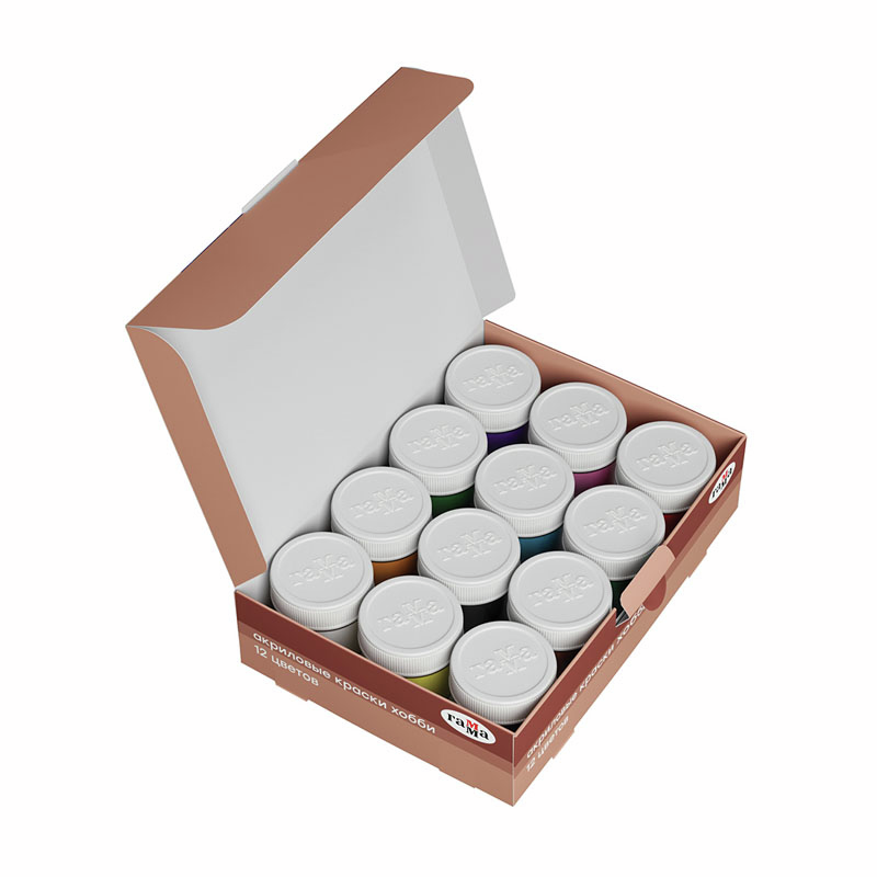 Акриловые краски серии Хобби предназначены для декоративно-оформительских работ и росписи бумаги, картона, холста, дерева, металла, гипса. Краски обладают высокой укрывистостью, хорошо смешиваются и быстро высыхают. После высыхания создают на поверхности глянцевый красочный слой. Акрил Хобби морозостойкий, выдерживает транспортировку при низких температурах. Благодаря удобной герметичной баночке с завинчивающейся крышкой, краски долго хранятся, не высыхая. В набор входят 12 цветов: белый, жёлтый, изумрудный, розовый, красный, коричневый, зелёный, синий, чёрный, фиолетовый, оранжевый, голубой. Объём одной баночки — 20 мл, общий объём — 240 мл.