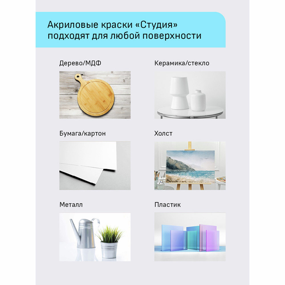 Набор новых акриловых красок серии Студия предназначен для художественно-живописных и декоративно-прикладных работ. Главные отличия: насыщенные цвета, высокая адгезия, прочность красочного слоя.