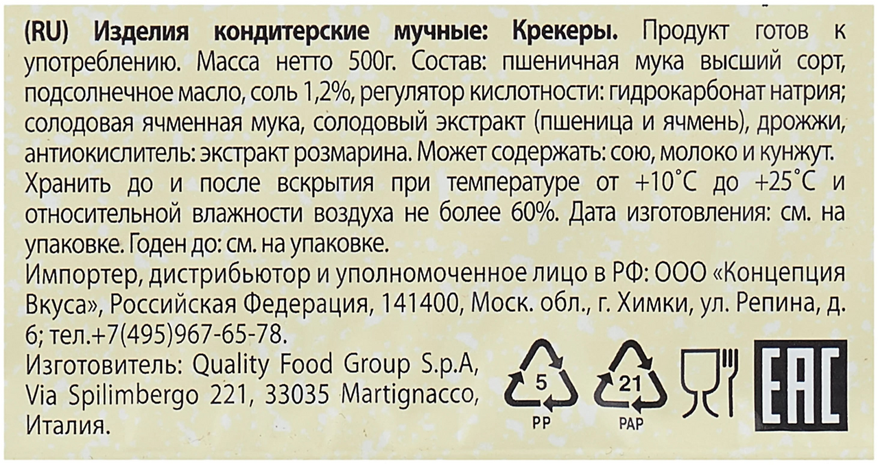 Пшеничная мука высший сорт, подсолнечное масло, соль 1,2%, регулятор кислотности гидрокарбонат натрия: солодовая ячменная мука, солодовый экстракт (пшеница и ячмень), дрожжи, антиокислитель: экстракт розмарина.