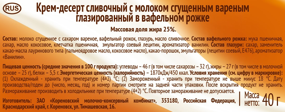 Молоко сгущённое с сахаром варёное (молоко нормализованное, сахар), масло сливочное, вафельный рожок (мука пшеничная хлебопекарная высшего сорта, сахар-песок, масло кокосовое, клетчатка растительная, эмульгатор - лецитин, ароматизатор пищевой ванилин), глазурь шоколадная, ароматизатор ванилин. Состав шоколадной глазури: сахар, заменитель какао-масла лауринового типа (пальмоядровое масло), какао-порошок, молоко сухое цельное, эмульгаторы (соевый лецитин, Е476), ароматизатор ванилин.