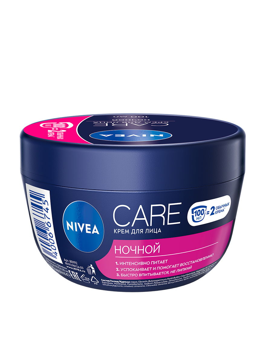 Ночной крем для лица Nivea Care с провитамином B5 быстро впитывается без ощущения липкости, интенсивно питает, успокаивает и помогает восстановлению кожи. Подходит для всех типов кожи. Большой объем крема 100 мл (в два раза больше, по сравнению с кремами для лица Nive в объеме 50 мл.) – хватит надолго даже при ежедневном использовании. Дерматологически протестировано. Применение: небольшое количество средства нанести в небольшом количестве на чистую кожу лица, шеи и зоны декольте мягкими массирующими движениями в течение 1-2 минут до полного впитывания. Попробуйте дополнить свой ежедневный уход, используя гель для умывания Care и нежный тоник для лица от Nivea, а также подобрав дневной увлажняющий крем Care, учитывая потребности кожи.