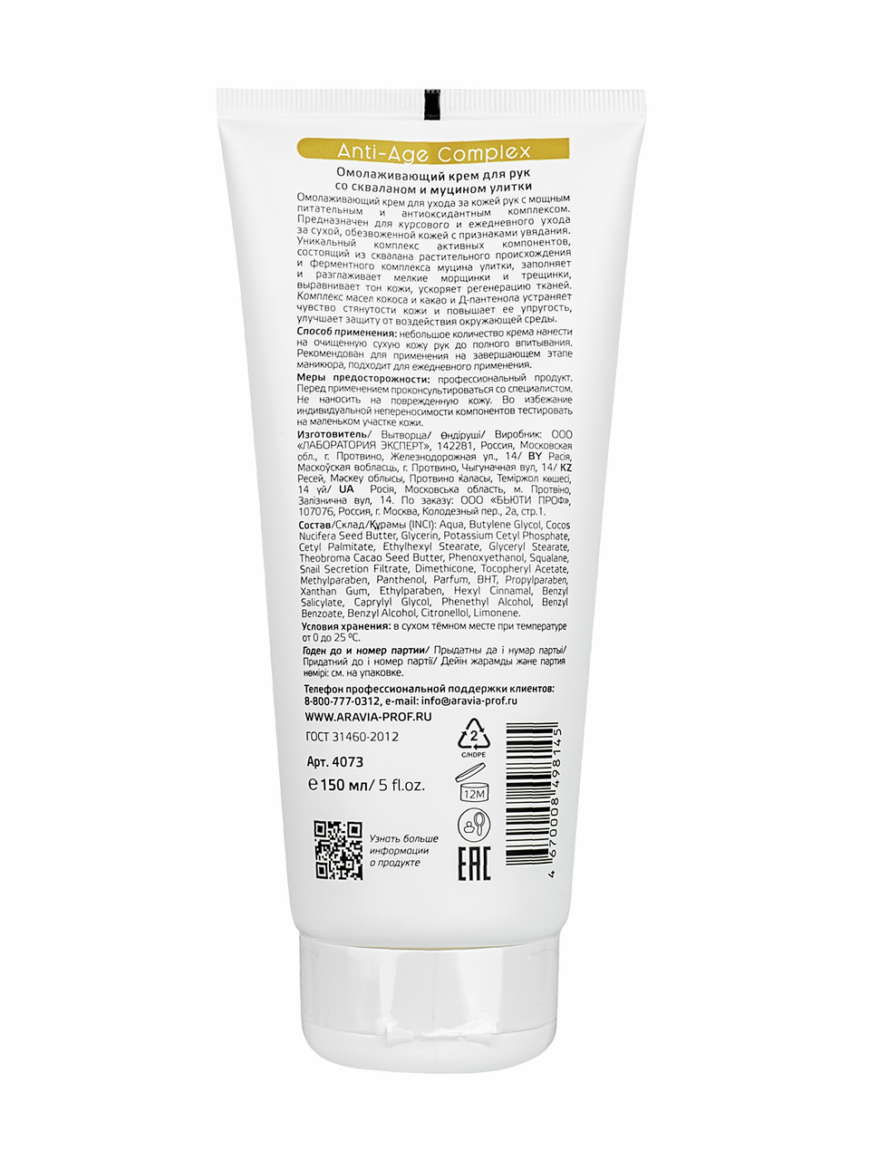 Крем для рук Aravia Professional Сквалан и муцин улитки, 150мл