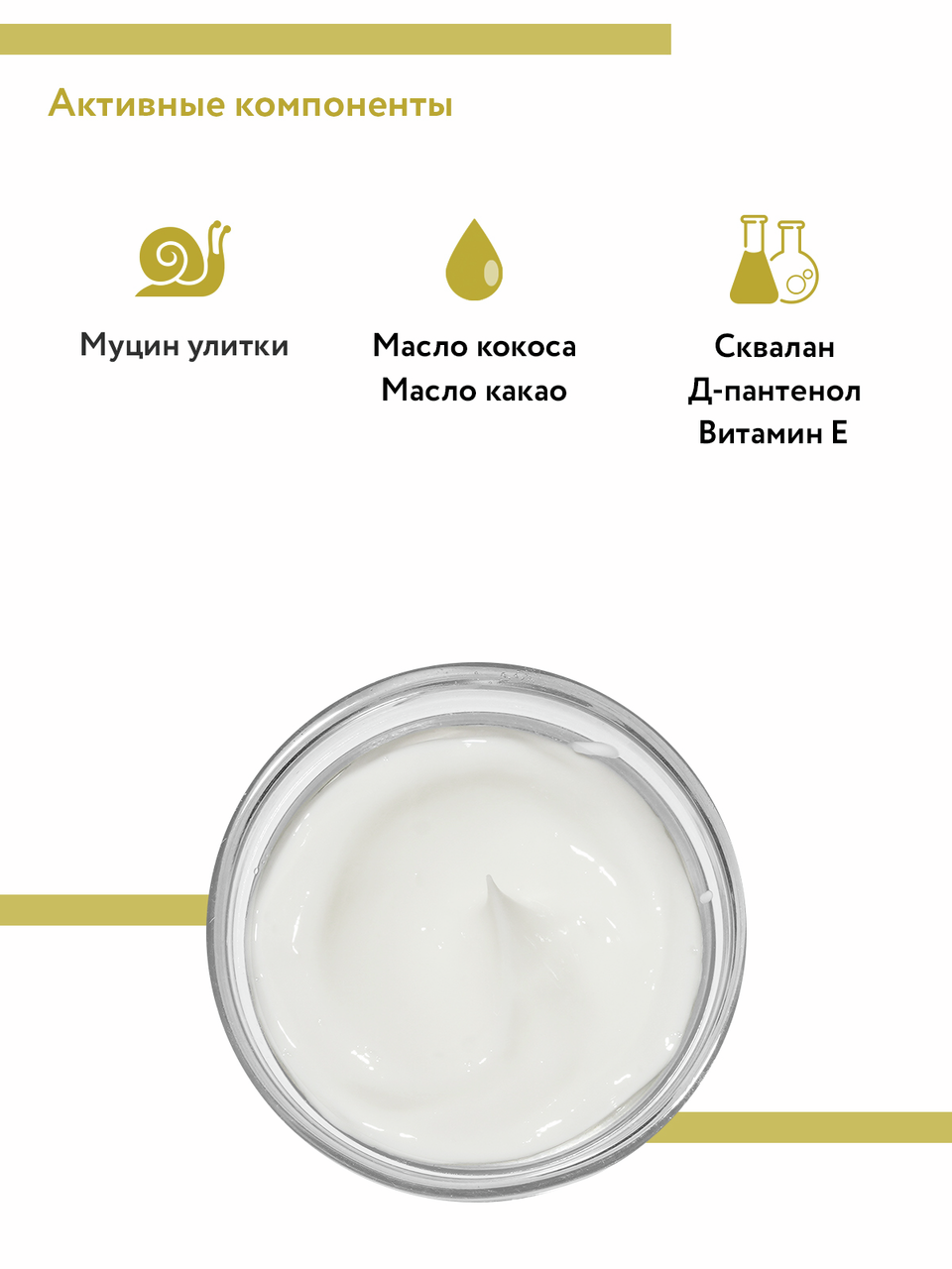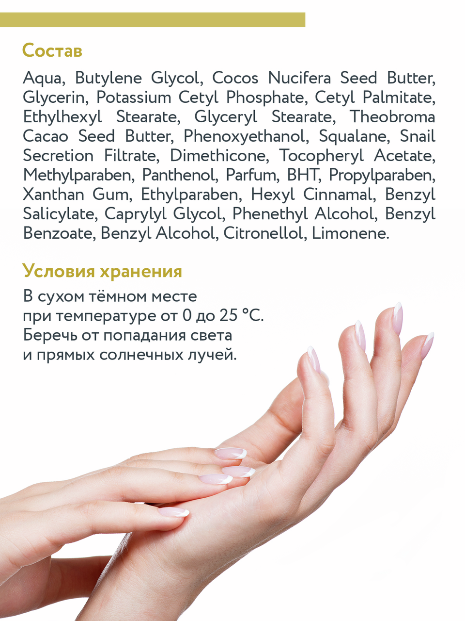 Омолаживающий крем для ухода за кожей рук с мощным питательным и антиоксидантным комплексом. Предназначен для курсового и ежедневного ухода за сухой, обезвоженной кожей с признаками увядания. Уникальный комплекс активных компонентов, состоящий изсквалана растительного происхождения и ферментного комплекса муцина улитки, заполняет и разглаживает мелкие морщинки и трещинки, выравнивает тон кожи, ускоряет регенерацию тканей. Комплекс масел кокоса и какао и Д-пантенола, устраняет чувство стянутости кожи и повышает ее упругость, улучшает защиту от воздействия окружающей среды.