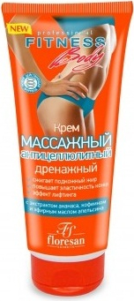 Floresan Фитнес body Крем массажный антицеллюлитный дренажный 200 мл создан специально для повышения антицеллюлитного действия массажа путем ускорения липолиза и естественного метаболизма жировой ткани. После нанесения крема на кожу во время проведения массажа благодаря комплексу из экстракта красного перца, зерен горчицы, никотиновой кислоты и эфирных масел происходит нагревание поверхности кожи, ускоряется циркуляция крови, что способствует расщеплению жира, активизации дренажа, выведению продуктов липолиза и излишков жидкости из подкожно-жирового слоя. Кофеин влияет на процесс похудения за счет стимуляции обмена веществ жировых клеток. Регулярное проведение массажа уменьшает проявления целлюлита, корректирует фигуру. Кожа тела подтягивается, приобретает упругость, молодой и здоровый внешний вид.