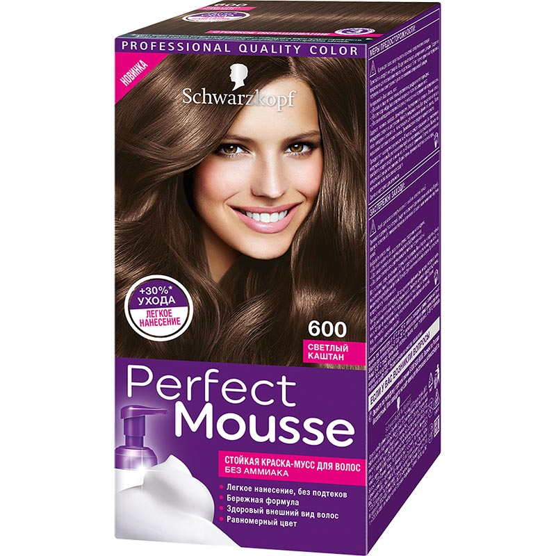Краска-мусс Palette Perfect Mousse 600 Светлый каштан. Краска-мусс создает 100% стойкости и не содержит аммиака. Окрашивает волосы без лишних усилий. Флакон-аппликатор обеспечивает гегкое дозирование и равномерное нанесение без подтеков.