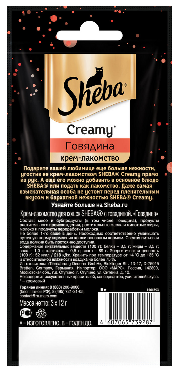 Новое крем-лакомство SHEBA Creamy с говядиной покорит Вашу кошку. Подарите вашей любимице еще больше нежности, угостив ее прямо из рук, или подайте SHEBA Creamy в мисочке как самостоятельное блюдо. Даже самая взыскательная особа не устоит перед пленительным вкусом и бархатной нежностью SHEBA Creamy.