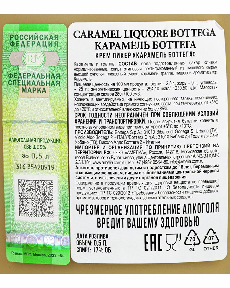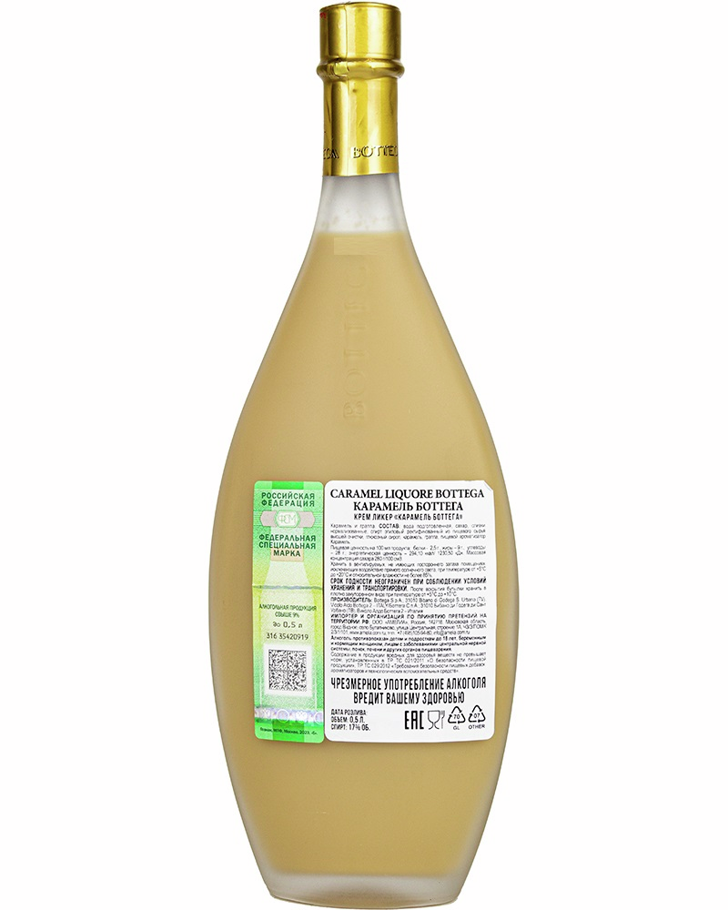 Сгущенное молоко является основным ингредиентом в составе этого напитка. Добавление граппы делает ликёр неповторимым во вкусе и аромате, полностью открывая богатую ароматическую палитру тёмного шоколада. Ликер светло - коричневого цвета. Интенсивный и яркий карамельный аромат. Сладкий, деликатный, молочный вкус с нежной структурой. Гастропары - в качестве дижестива после еды. Идеально в качестве ингредиента в коктейлях. Сладкий сливочный ликер на основе граппы с карамельным вкусом и незабываемым ароматом. Ликер Caramel производит компания Distilleria Bottega, долгое время специализирующаяся на производстве граппы. Именно по этой причине граппа стала одной из главных составляющих ликера, добавляя ему необыкновенный вкус. На создание ликера производителя вдохновили традиционные сладости (ириска, британский вид конфет), при изготовлении которых используют типичные южноамериканские сливки Dulce de leche, также известные как молочный джем, приготовленные из молока и сахара. Существует легенда, что сливки были созданы по ошибке в Аргентине в XIX веке, когда повар оставил на плите кастрюлю с молоком и сахаром. Ликер рекомендуется подавать охлажденным, он идеален в качестве дижестива, а также гармонично сочетается с выпечкой и десертами. На основе этого ликера готовят разнообразные коктейли.