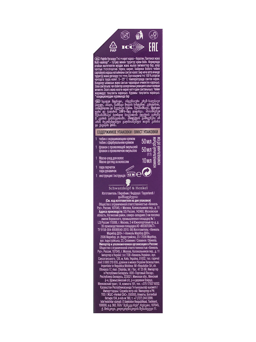 Формула с высокоинтенсивными пигментами проникает глубоко внутрь волоса, защищая цвет от вымывания. Стойкий насыщенный цвет надолго и 100% закрашивание седины. Формула и маска-уход с тройной системой ухода с кератином, пантенолом и nutri-маслом обеспечивают бережную заботу о волосах. Палетт укрепляет, разглаживает волокна волос и наполняет их цветом для роскошного стойкого оттенка. Защита от вымывания цвета. Экстрауход во время и после окрашивания. 100% закрашивание седины.