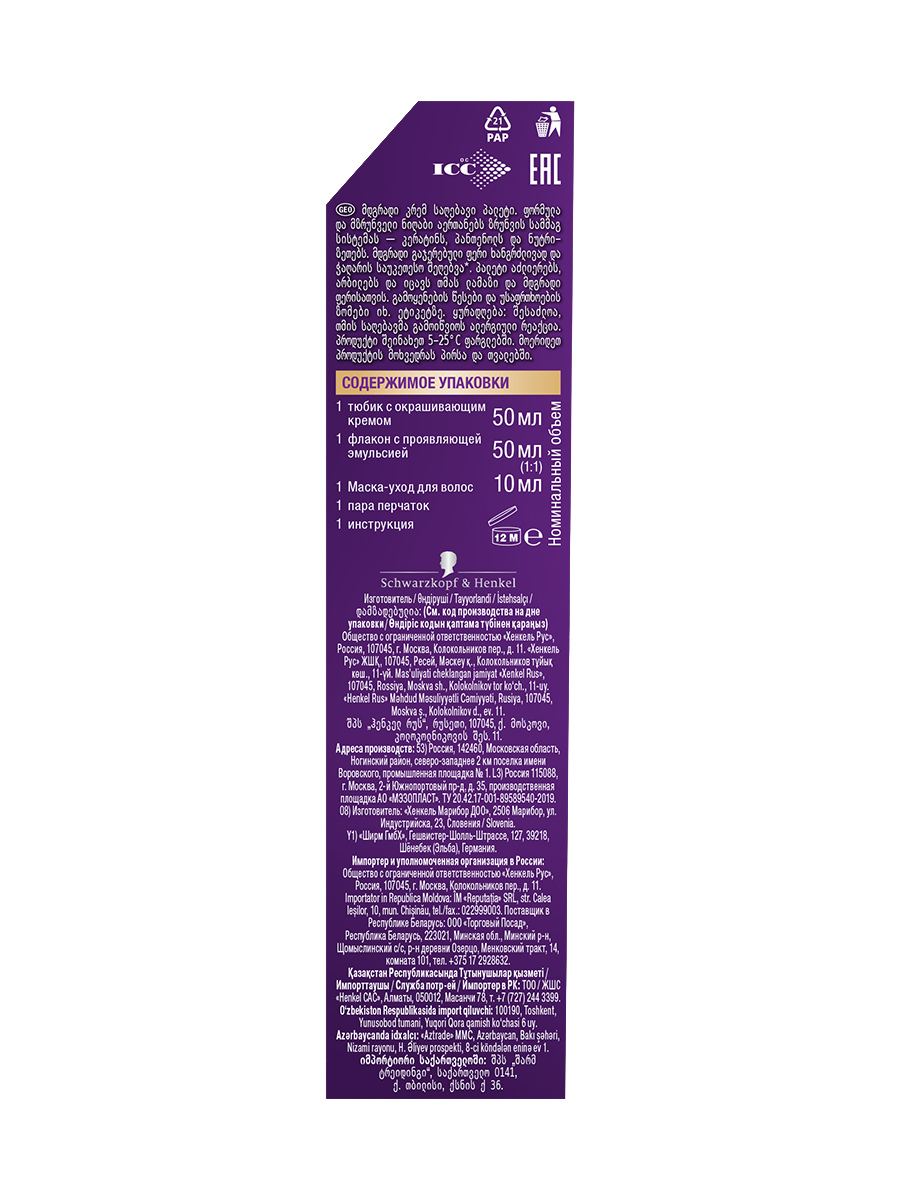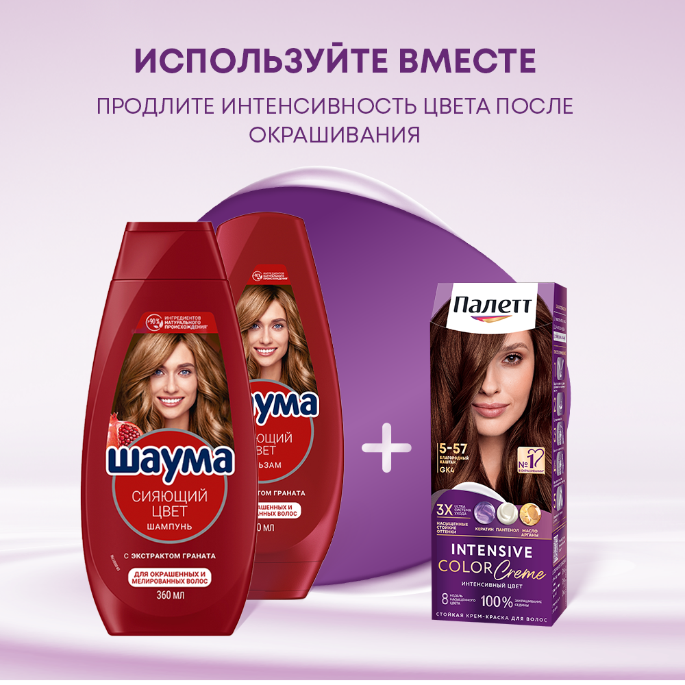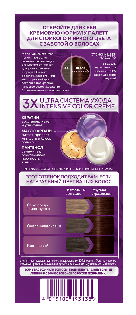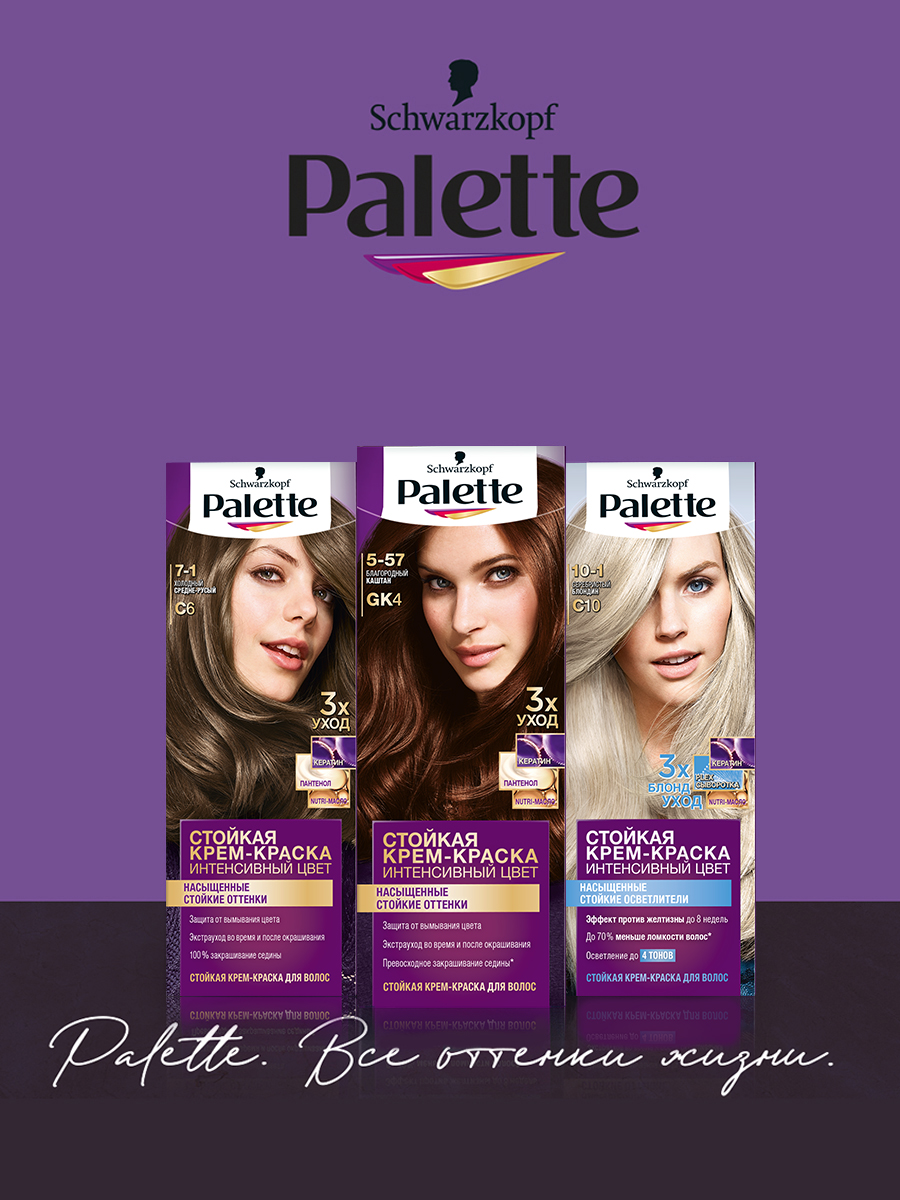 Благодаря тройной системе ухода стойкая крем-краска для волос Палетт обеспечивает бережное окрашивание. С аммиаком. Комплекс с Кератином, Пантенолом и Аргановым маслом проникает глубоко в структуру волоса, восстанавливая, увлажняя и питая его изнутри. Активные вещества оказывают смягчающее и укрепляющее воздействие, делая волосы гладкими и блестящими. Формула с высокоинтенсивными пигментами придает волосам насыщенный цвет и защищает его от вымывания. До 100% без седины. Надолго!