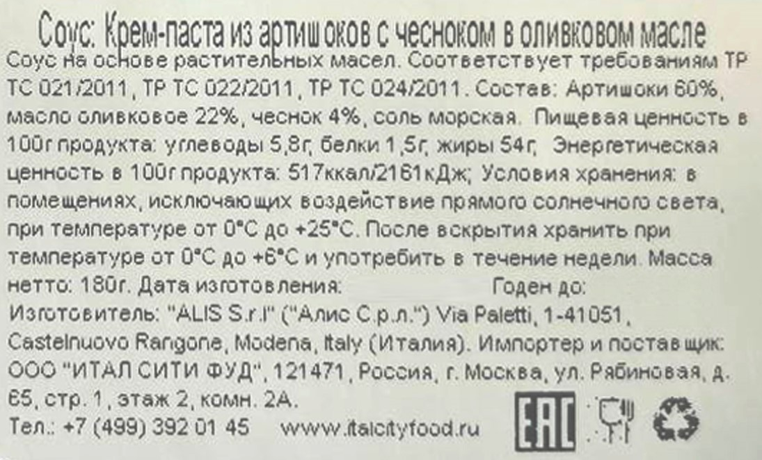 Артишоки 60%, масло оливковое 22%, чеснок 4%, соль морская.