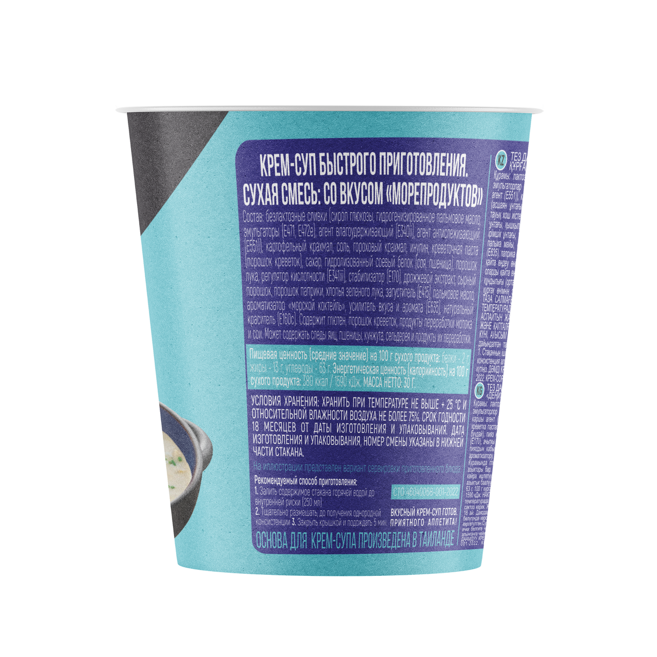 Морское ассорти, обжаренное с луком и болгарским перцем, пюрированное с добавлением сливок и краба. Залив в стакан кипяток и подождав пару минут, можно получить порцию ароматного обеда в азиатском стиле.