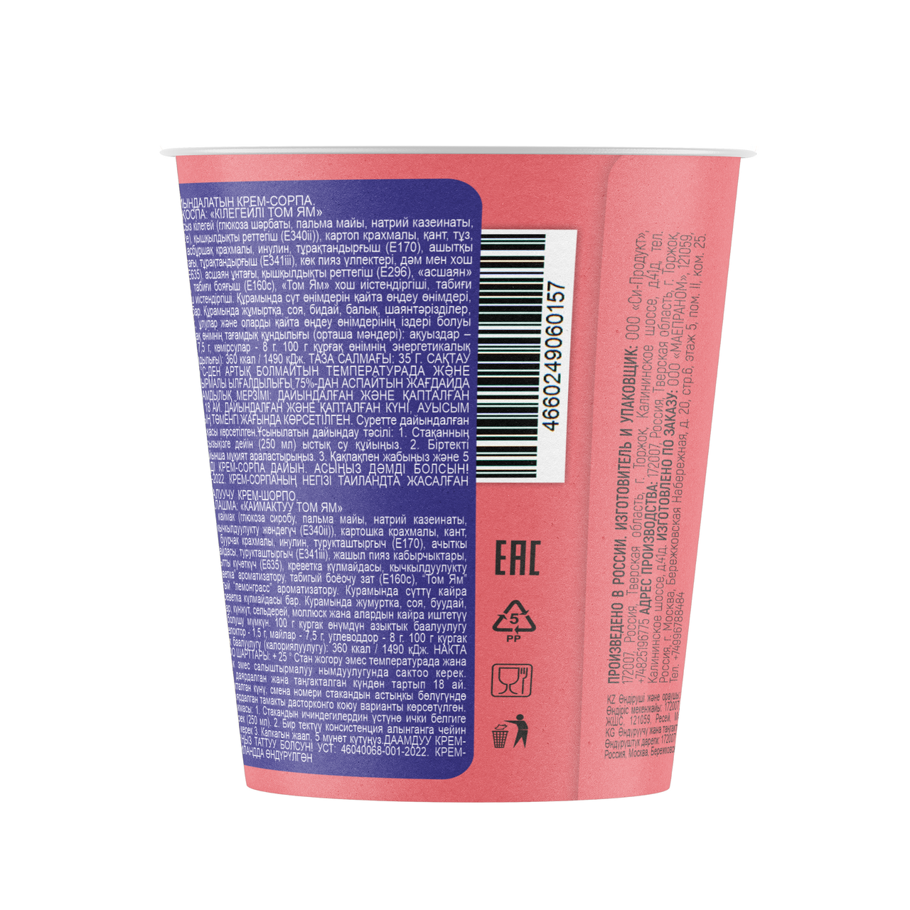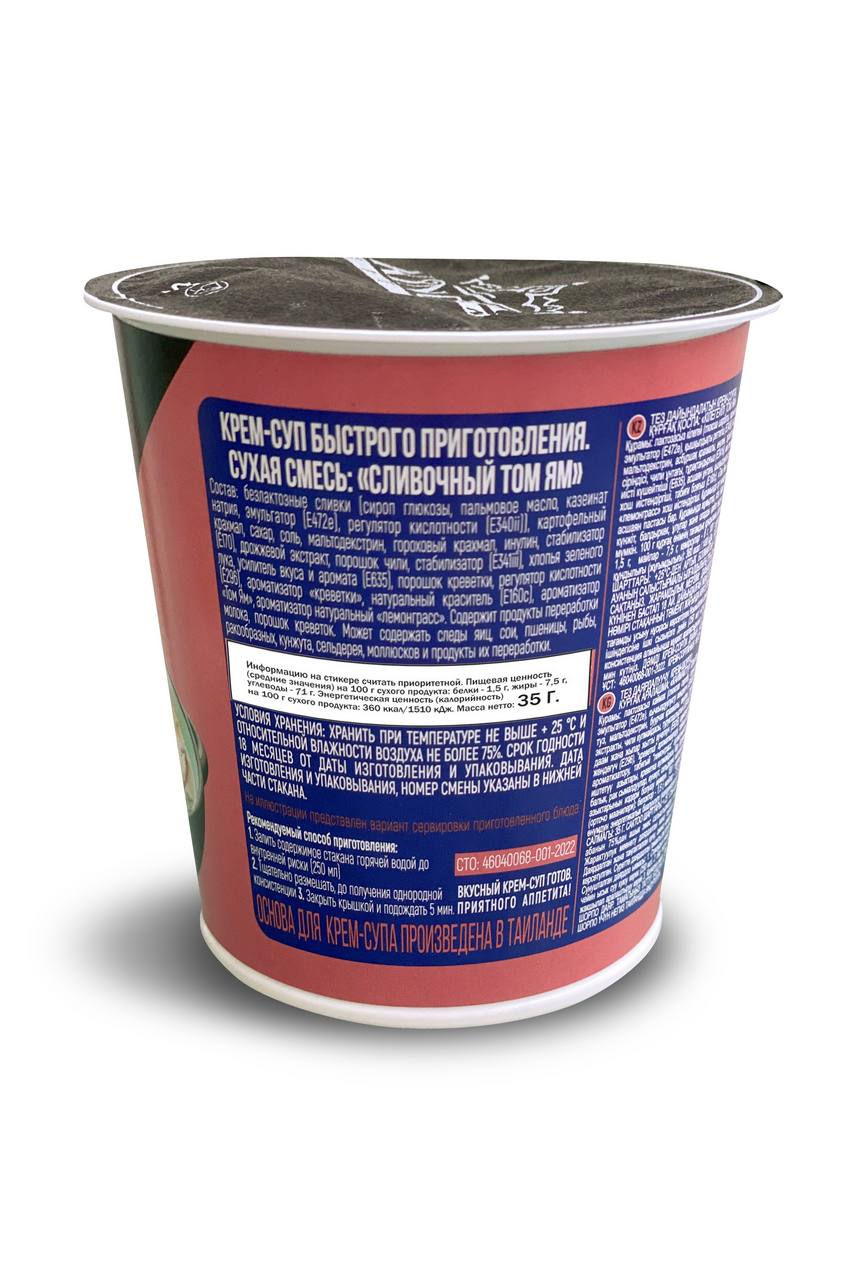Безлактозные сливки (сироп глюкозы, пальмовое масло, казеинат натрия, эмульгатор е472е, регулятор кислотности е340ii), картофельный крахмал, сахар, соль, мальтодекстрин, гороховый крахмал, инулин, стабилизатор е170, дрожжевой экстракт, порошок чили, стабилизатор е341iii, хлопья зеленого лука, усилитель вкуса и аромата е635, порошок креветки, регулятор кислотности е296, ароматизатор креветки, натуральный краситель е160с, ароматизатор том ям, ароматизатор натуральный лемонграсс.
