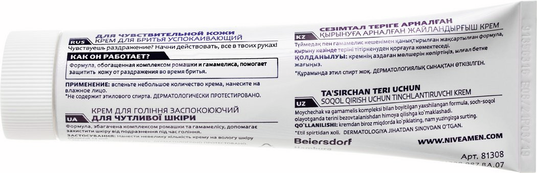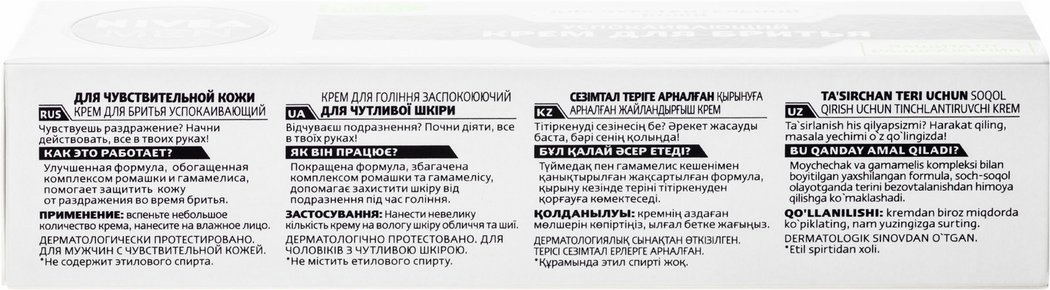 Nivea Men представляет линию средств для и после бритья, разработанную специально для чувствительной кожи. Успокаивающий крем для бритья, обогащенный экстрактом ромашки и гамамелиса, предотвращает пять признаков раздражения кожи: жжение, покраснение, сухость, ощущения стянутости и зуда. Крем не содержит спирта и поэтому идеально подходит для чувствительной кожи. Вместо спирта антибактериальным компонентом выступает экстракт гамамелиса. Для предотвращения дискомфорта во время бритья и после, используйте продукты Успокаивающей линейки Nivea Men для чувствительной кожи. Испытывайте комфорт без раздражения и сухости кожи после каждого бритья. Применение: выдавите необходимое количество крема на ладонь. Распределите по лицу, побрейтесь. Для дополнительного увлажнения и ухода за кожей используйте лосьон или бальзам после каждого бритья.