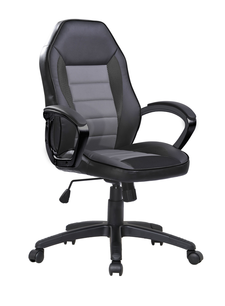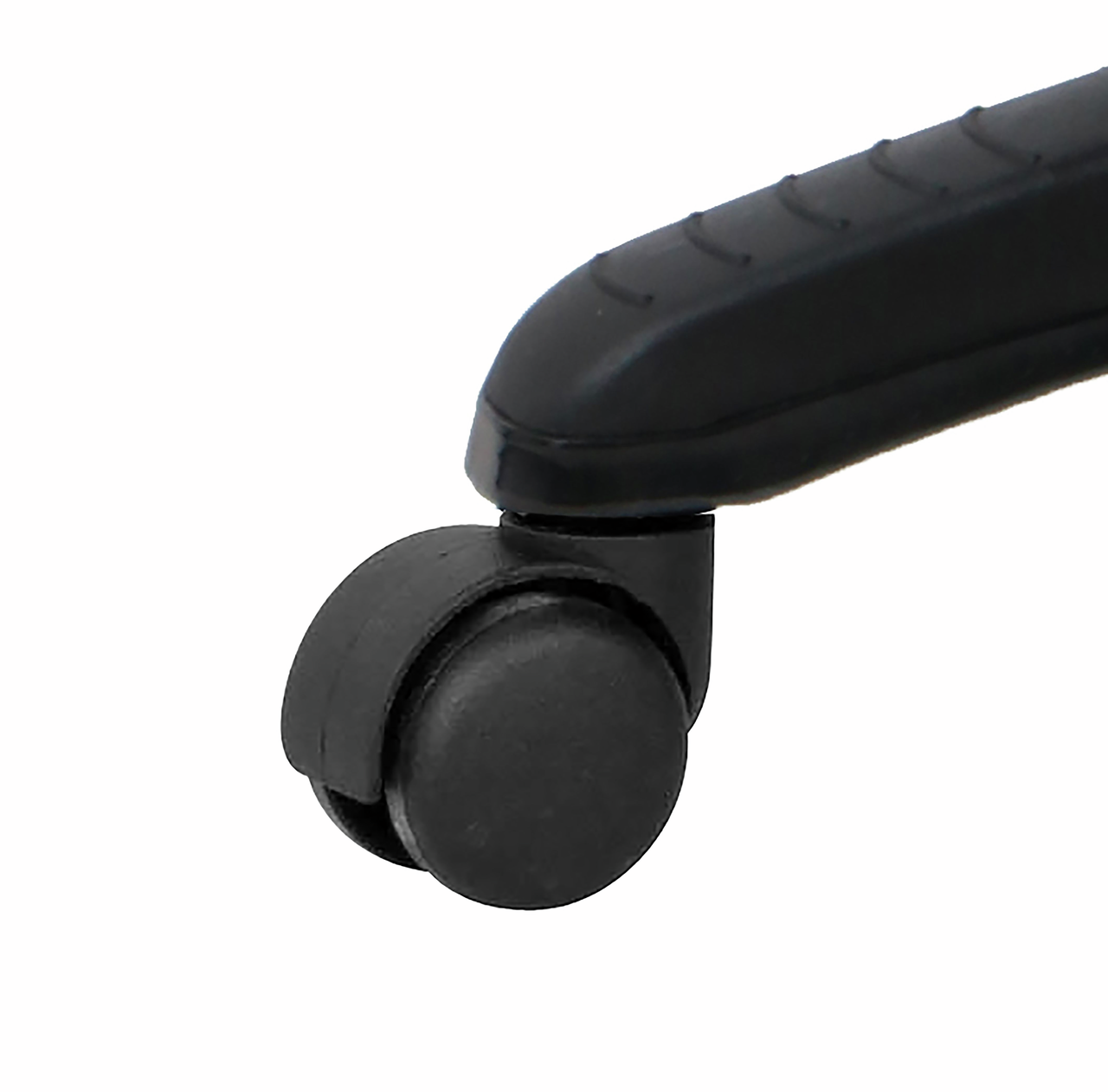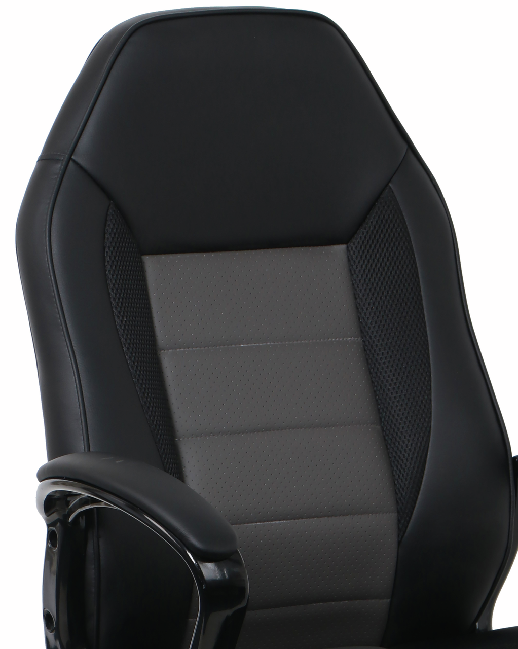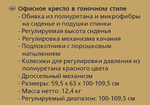 Кресло с мягкими, обитыми тканью, сиденьем и спинкой. Подлокотники обиты искусственной кожей. Высота сиденья, угол наклона спинки и глубина сиденья регулируется. Металлическая база закрыта пластиковыми накладками. Ролики со стопором. Общая высота: 110-120мм. Высота сиденья без нагрузки: 450-545мм. Глубина (от спинки до переда ): 585мм. Общая глубина: 615мм. Ширина (от подлокотника к подлокотнику): 620мм. Размер базовой рамы с колесиками: 690мм. Материал: искусственная кожа и обивка из микрофибры на подушке сиденья и спинке.